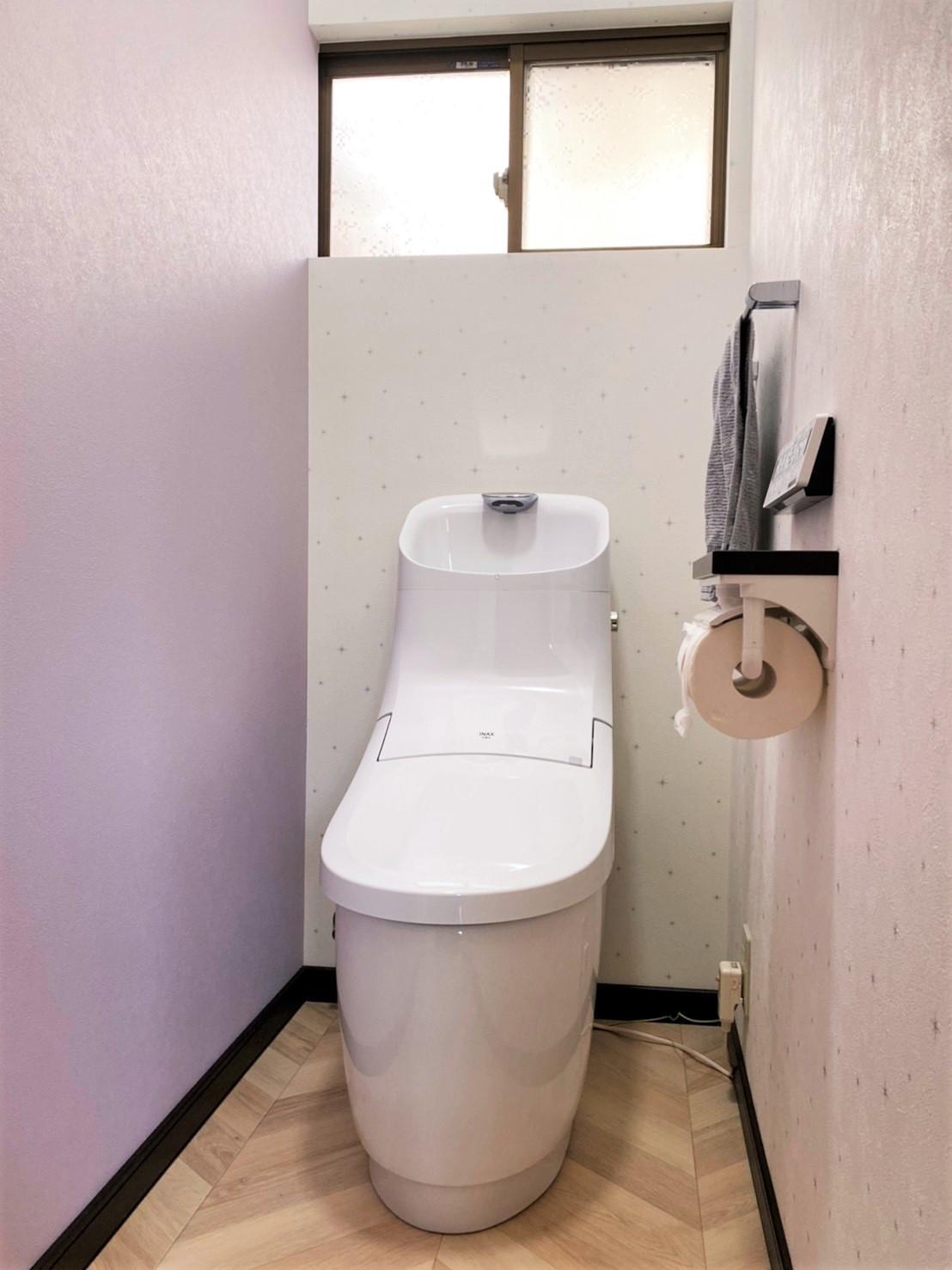 ★「水廻りをきれいにしたい」というご要望でリフォームをさせていただきました。 ★リフォーム前は和式のトイレを洋式にして使用されていました。段差があり使い勝手が悪く、便器の交換と併せて床をフラットにさせていただきました。 ★便座フタの自動開閉や便器の自動洗浄機能が付いているので、とても使いやすいトイレです。 ★壁紙のクロスや床のクッションフロアシートは弊社のコーディーネーターがお客様との打ち合わせで選んだものです。 ★とても素敵なトイレ空間となりました!