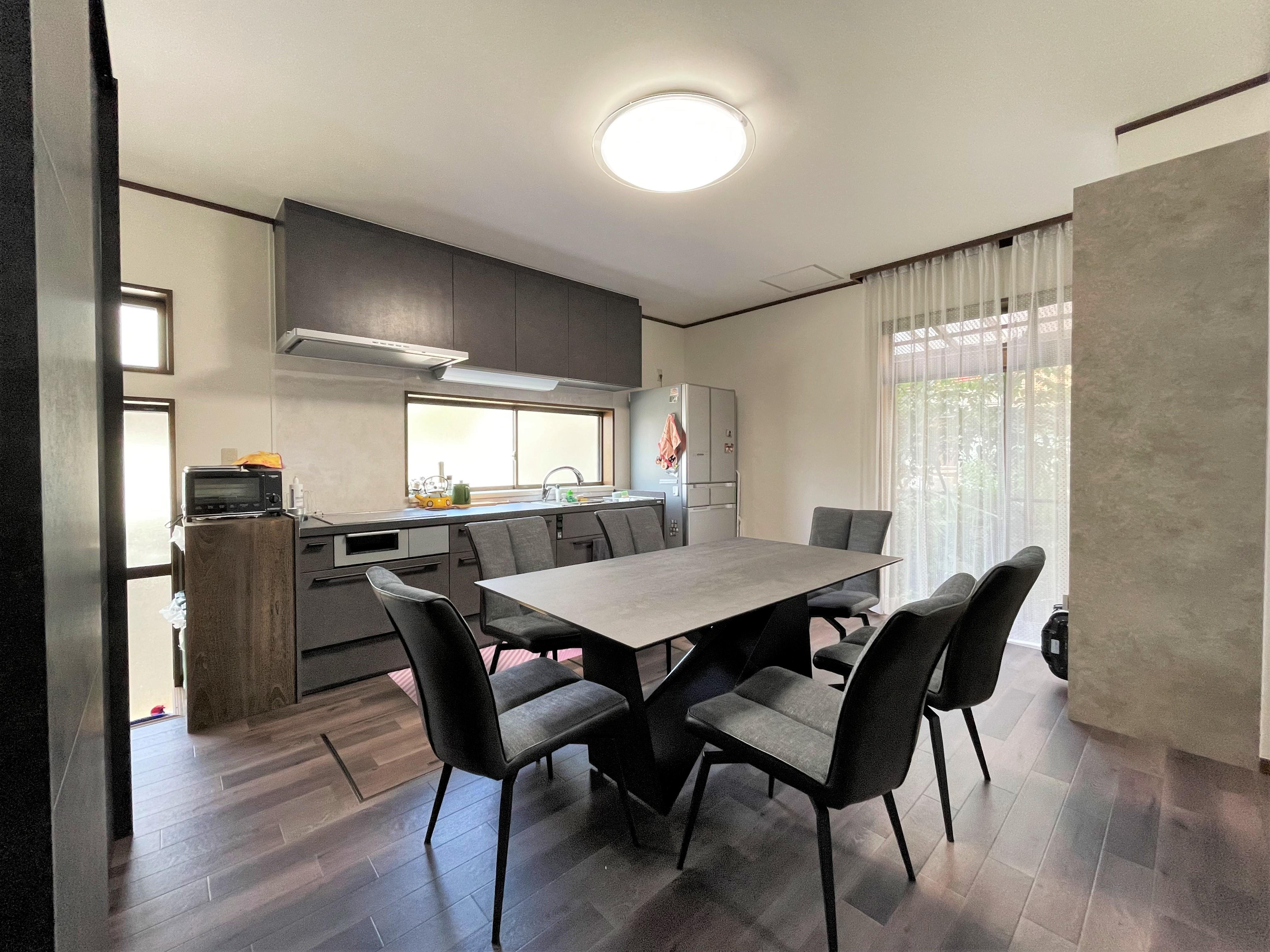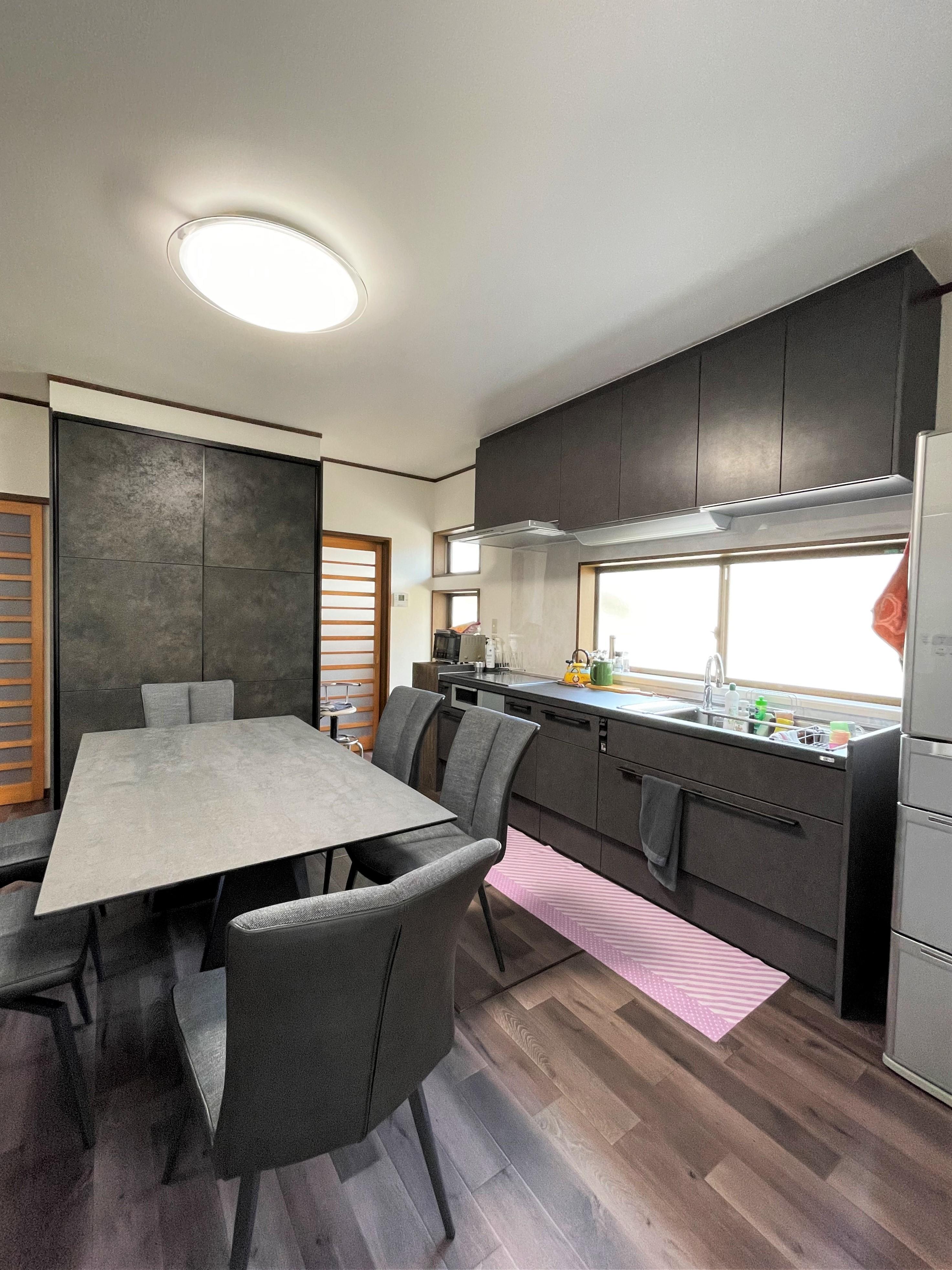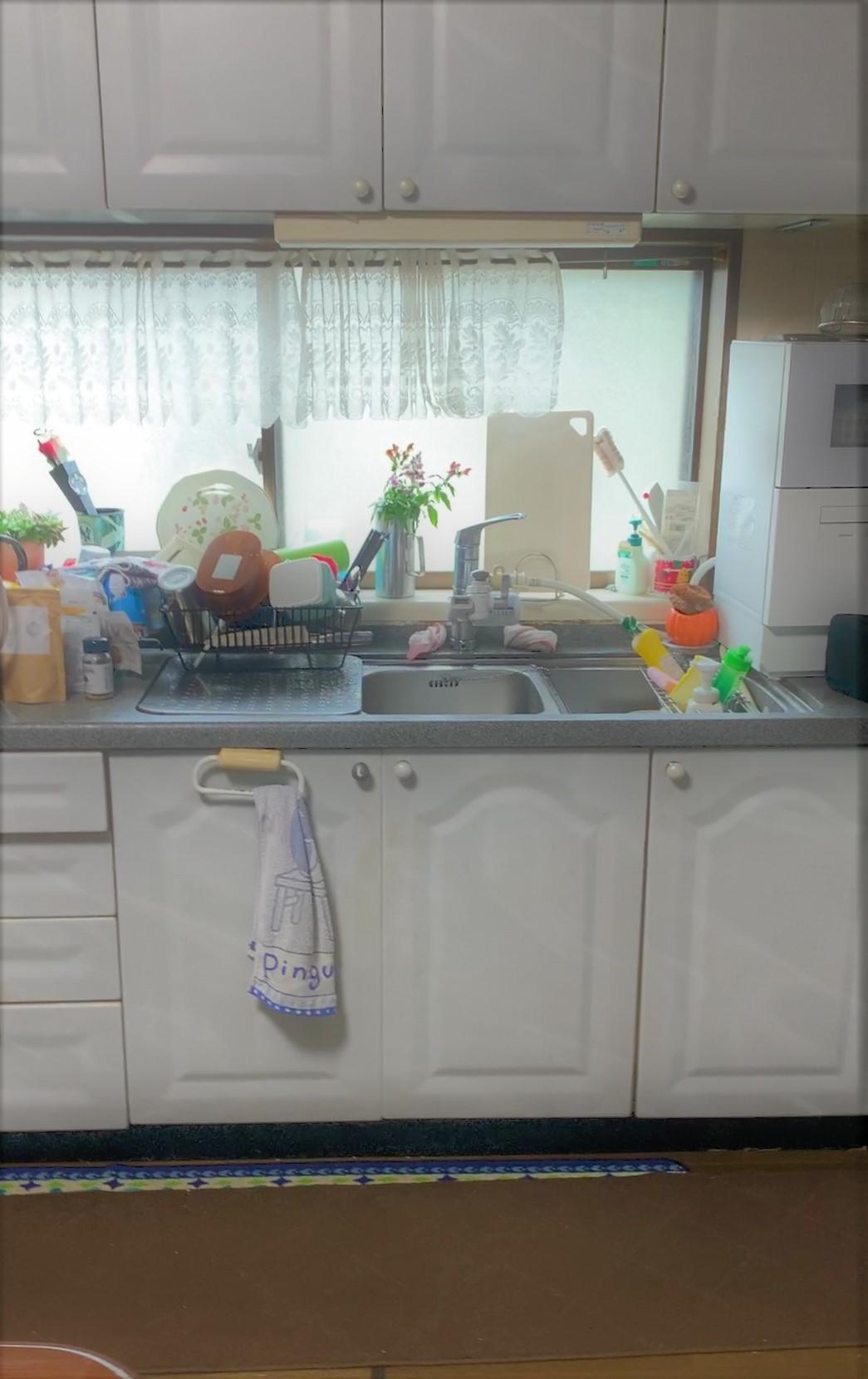 ★キッチンの収納扉が壊れたことがきっかけでリフォームをされました。 ★商品を決められるまでに半年ほどいろいろなショールームを回り、キッチンはLIXILリシェル、収納はクリナップに決められました。 ★斜めに開く扉やゆっくり閉まる機能(ソフトモーションレール)、たっぷり入る引出し収納、扉の色とセラミックトップの質感が部屋の雰囲気にとても合っています。 ★ゴミ箱収納と家電収納棚はご主人様の手作りです。