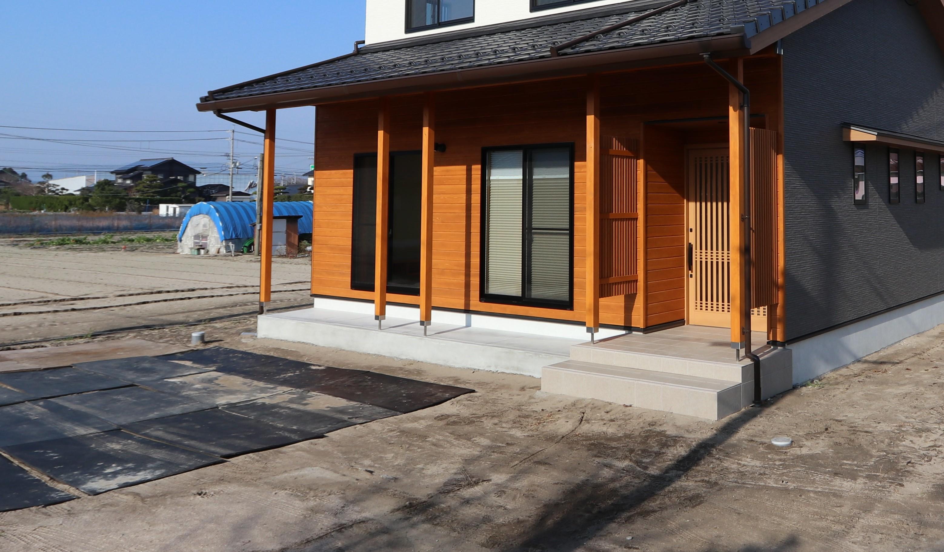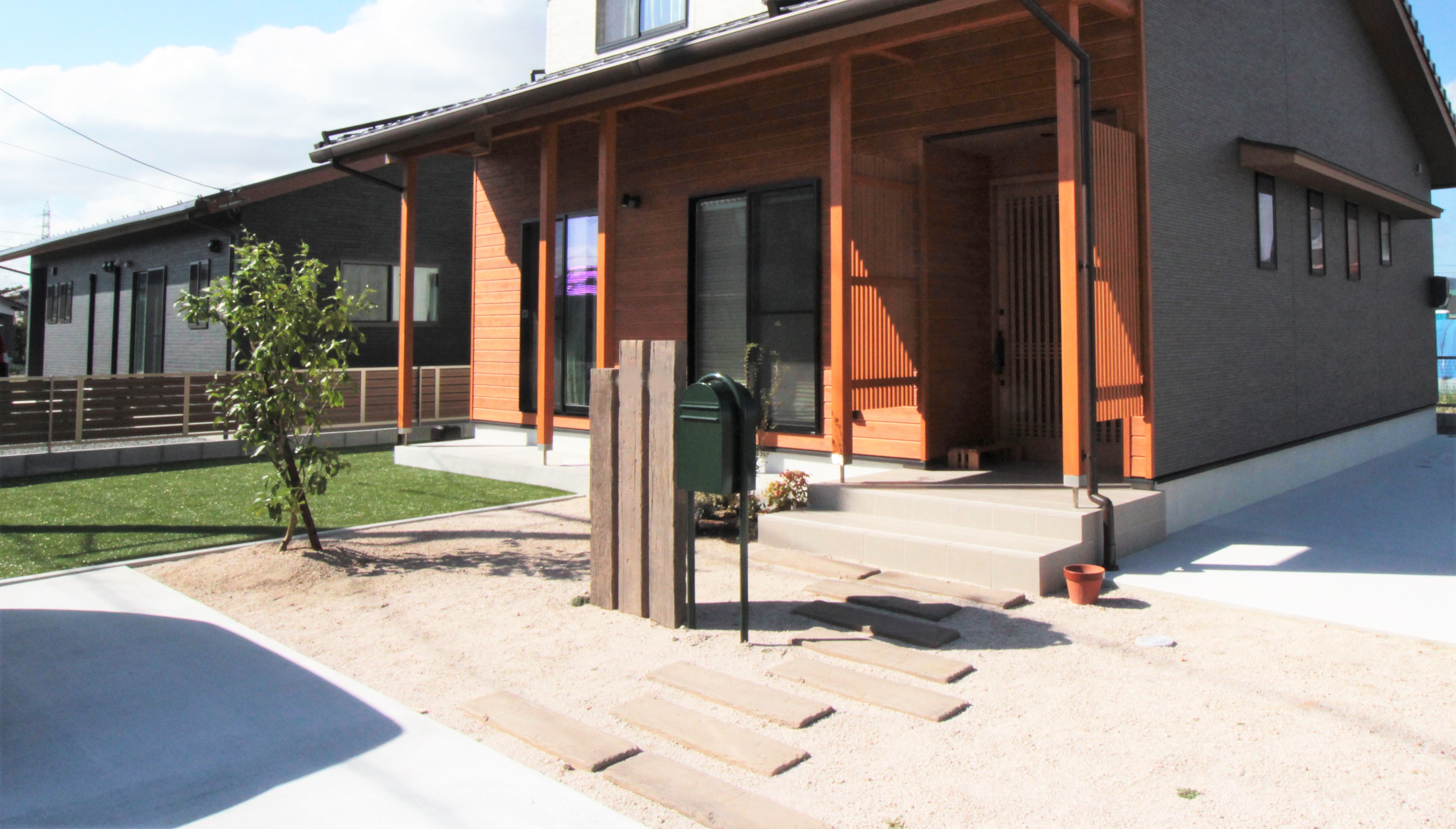 ★新築お引渡し後に外構工事をご依頼くださいました。 ★外構工事内容(アルミフェンス、門柱、駐車場コンクリート、人工芝、建物まわり砂利敷き、植栽)