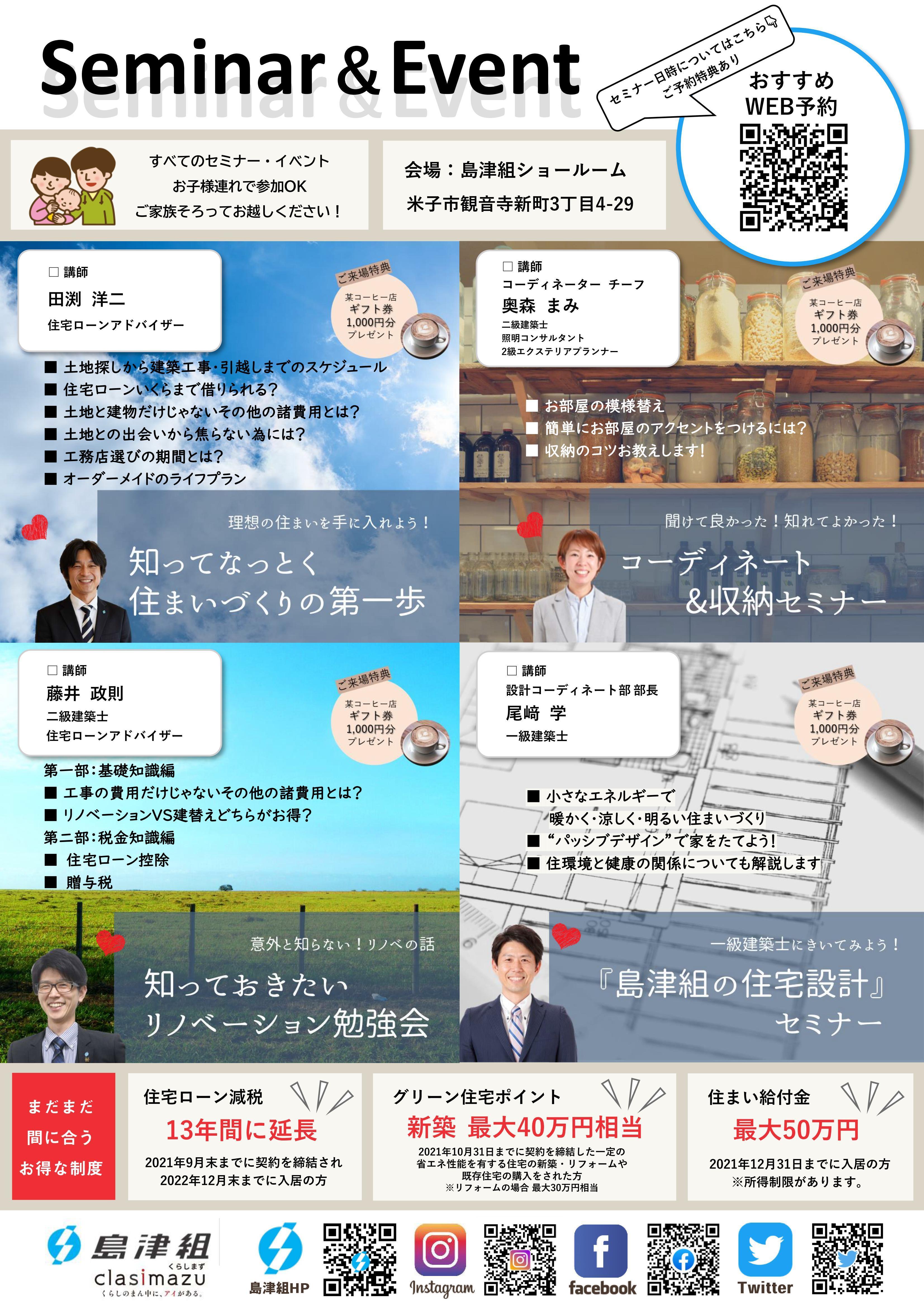 毎月好評いただいているセミナーの 6月の開催日程のご案内です。 今までご予定が合わず 「予約できなかった・・・」という方も、 この機会にぜひご来場くださいませ! みなさまお待ちしております。 どのセミナーも ◎参加費無料 ◎各回限定3組 です。 ***セミナー情報&ご予約はこちらから*** ↓ ↓ ↓ ↓ ↓ ↓ ↓ ↓ ↓ ↓ ↓ ↓ ↓『知ってなっとく住まいづくりの第一歩』 ➀6/5(土) 10:00~11:30 ➁6/20(日)13:30~15:00 ♥『お家』を考え始めた方におすすめ! ――「建てたい」と思ってるけど、 どう進めたらいいの? と 悩まれている方、ぜひご参加ください! ご予約はこちらから 『知っておきたいリノベーション勉強会』 ➀6/6(日) 13:30~15:00 ➁6/20(日)10:00~11:30 ♥中古物件購入やご実家の同居など 考えている方におすすめ! ――リノベーションのメリットは? 新築と比べるとどうなの? と 疑問のある方、ぜひご参加ください! ご予約はこちらから 『島津組の住宅設計』セミナー ・6/26(土)13:30~15:00 ♥『お家』を考え始めた方におすすめ! ――島津組の住まいづくりと 共に役立つ情報も満載! ご家族みなさんの健康に関わる 『快適な住まいづくり』に ご興味のある方、ぜひご参加ください! ご予約はこちらから 『コーディネート&収納セミナー』 ・6/17(木)10:00~11:30 ♥リフォームをお考えの方におすすめ! ――「素敵にしたい」という思いはあるのに、 どこか納得いかない...と悩まれている方 ぜひご参加ください! ご予約はこちらから 島津組のショールームで ゆったりとくつろぎながら、 私たちと一緒に 快適な住まいづくりを実現させましょう!