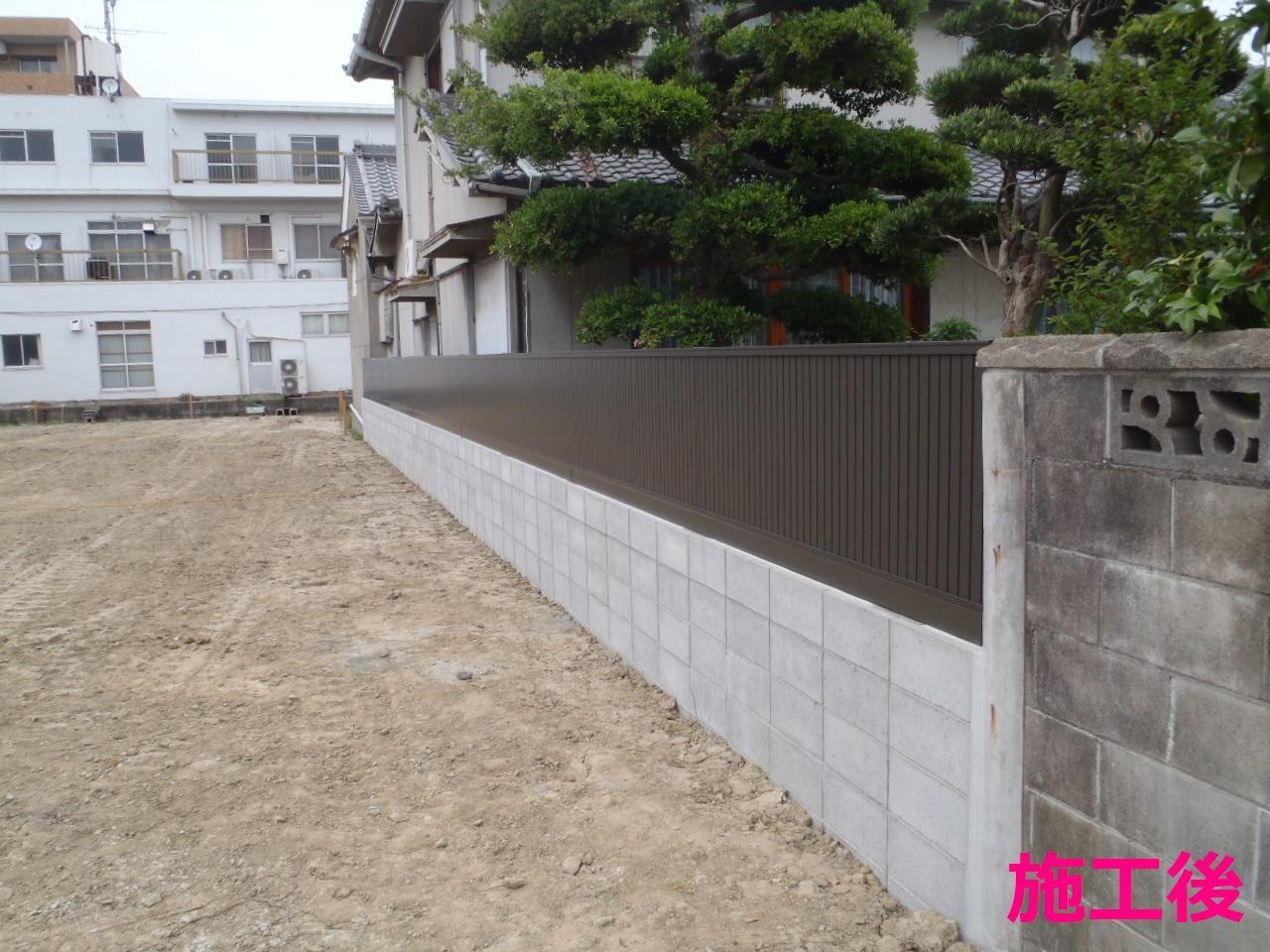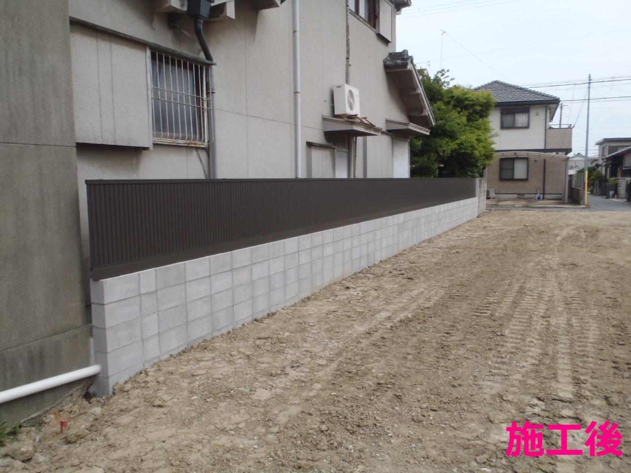 経年劣化によるブロック塀の改修工事でしたが、隣地に雨水の排水が流れ出している状態だった為、境界を越境せずに道路へ排水する工事も同時に行いました。近年、地震等の影響でブロック塀の倒壊が危惧されているので上部を目隠しフェンスをご提案し、重量を減らすことで倒壊しにくい構造にしました。