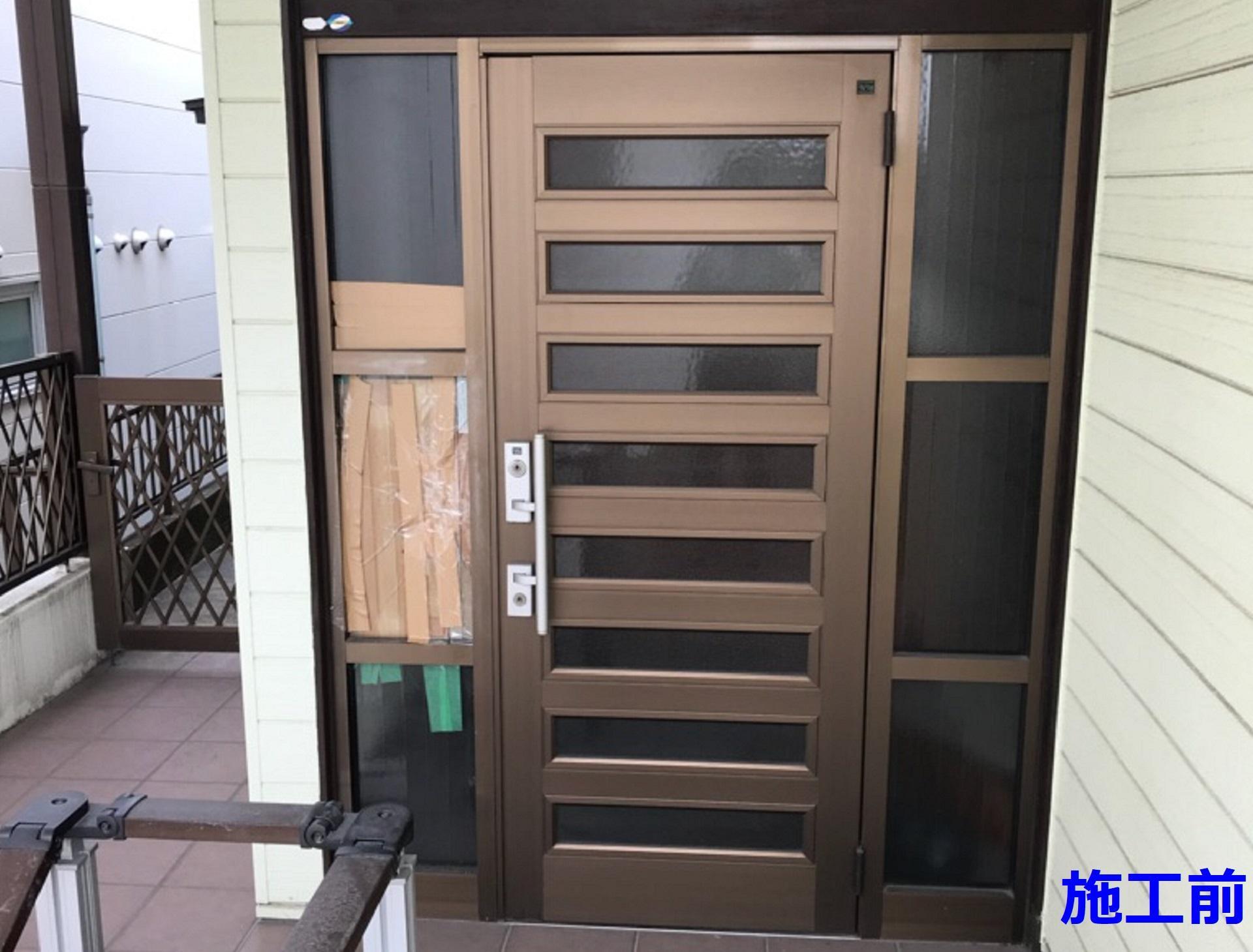 ガラスを割られてしまう被害にあったT様。一日で工事ができるリシェントを採用しました。今回は防犯対策をしっかり行ってほしいとのご希望でしたので両袖のガラス部分は特注の防犯ガラスにし、さらに玄関の内側に防犯フィルムを貼り、最大限の防犯対策を取り入れました。今回のドアはすっきりとしたデザインで色も落ち着いた色合いのドアになりました。