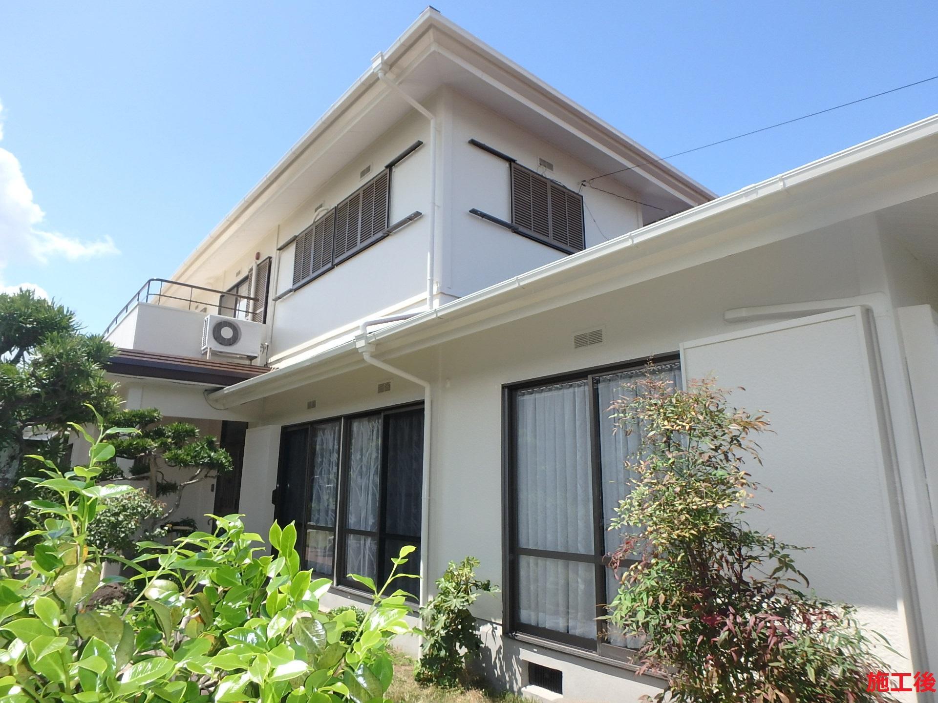 カラーベスト屋根の老朽化が気になりはじめた事をきっかけに、外壁と屋根を塗装することになりました。塗装することで屋根材を保護し、その後の寿命を延ばすことが出来ます。ホワイト系の外壁になり、とても明るく生まれ変わりました。