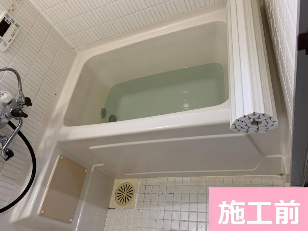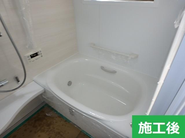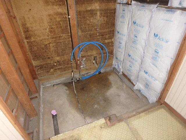 外側の壁に断熱材が無かったので追加しました。白い縦長のものが断熱材です。給排水(水湯と排水)の配管を前の浴槽の位置から、新しい浴槽の位置にやりかえます。M様のお家は前のお風呂もシステムバスだったので、土間はそのままで使えます。※在来のお風呂ですと、ここで「土間打ち」という工程とその「養生」(コンクリートが固まるのを待つ)で2日ほど要します。
