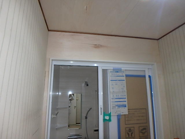 大工さんによって空いていた壁や床が出来上がりました。入口にも樹脂の枠材を使っています。このように浴室側の壁がクロスを貼る必要があるので、浴室の取替工事をされる際に、洗面所の壁(クロス)と床(クッションフロアー)を貼替えるかたも多くいらっしゃいます。床も浴室としっかり繋がっていますので、この日からお風呂に入ることが可能です。養生はするのですが、なるべく洗面所側は濡らさないように気をつけて入っていただきます。なぜ写真が上だけなのかといいますと、浴室との距離の都合でどうやっても全体での写真が撮れないのです。私も全体をお見せしたいのですが、申し訳ございません…。