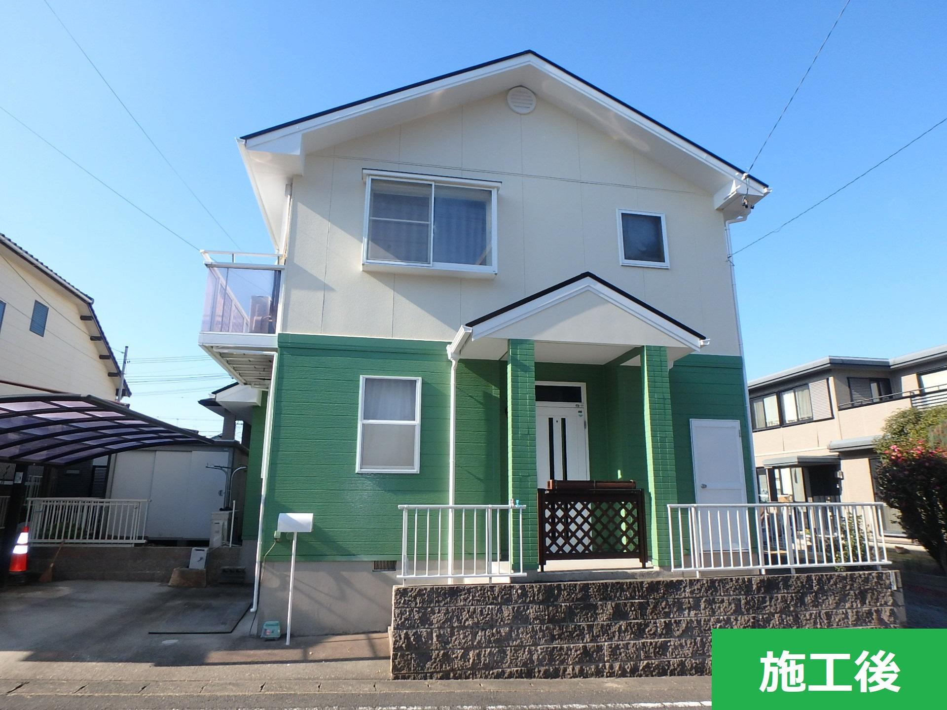 外壁と屋根の色あせを気にされていたK様。より長持ちする塗料がいいということで、フッ素の塗料で塗装させていただきました。シュミレーションをして色を決定し、鮮やかですてきな仕上がりになりました。