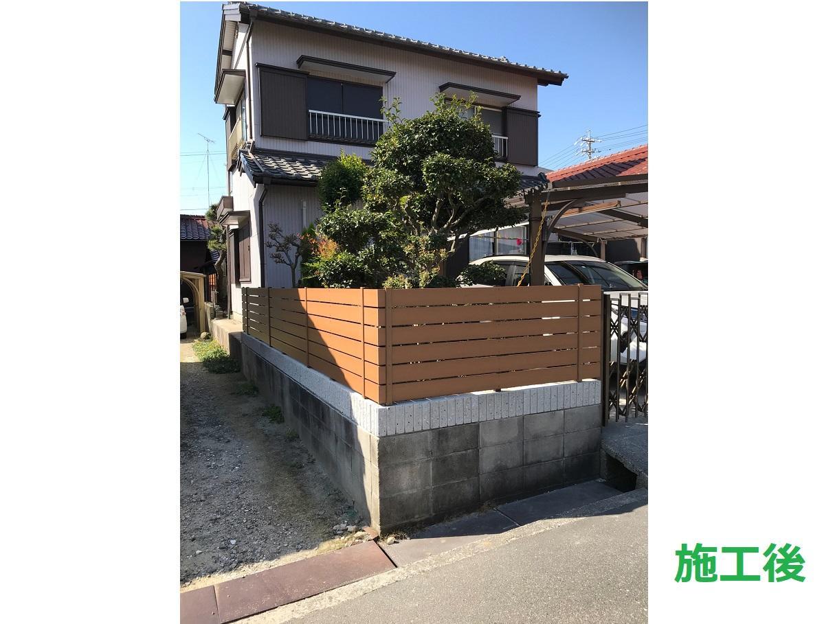 木塀の腐食及びブロック塀の老朽化に伴い樹脂製のフェンスに取替えました。見た目は木板フェンスですが、腐食の心配もなく長く使っていたただけます。