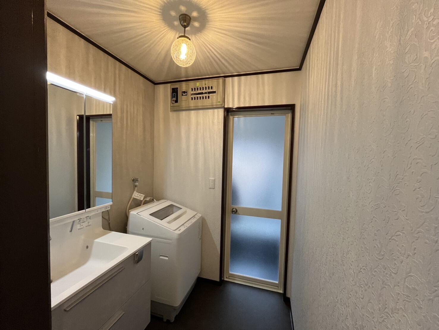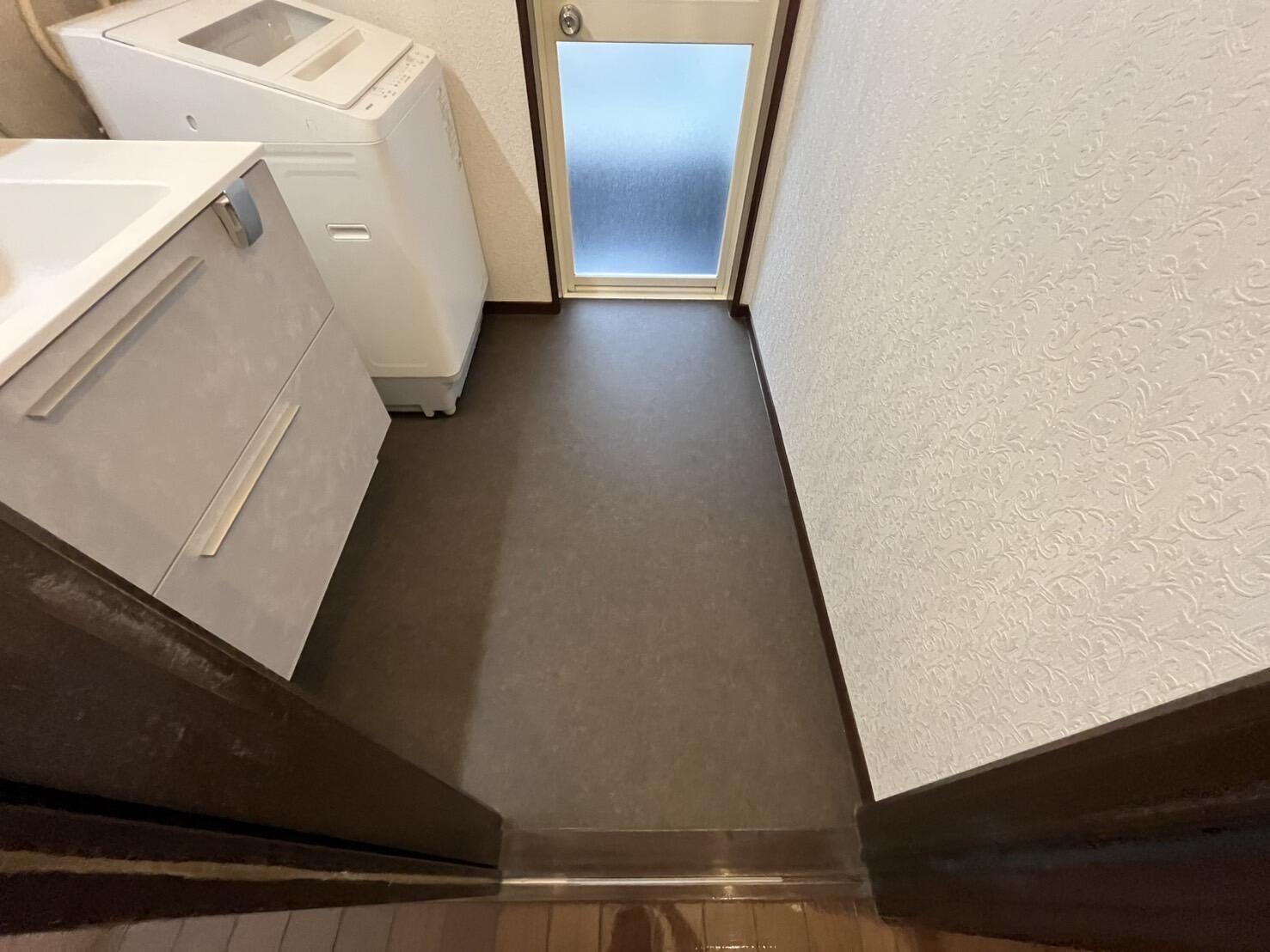 奥様が選んだ扉の色はスタッコグレー。マットな質感でとても高級感があります。床・壁紙・洗面台とトータルコーディネートされていて、素敵な洗面空間になりました。照明もアンティーク調のおしゃれな照明に代わりました。