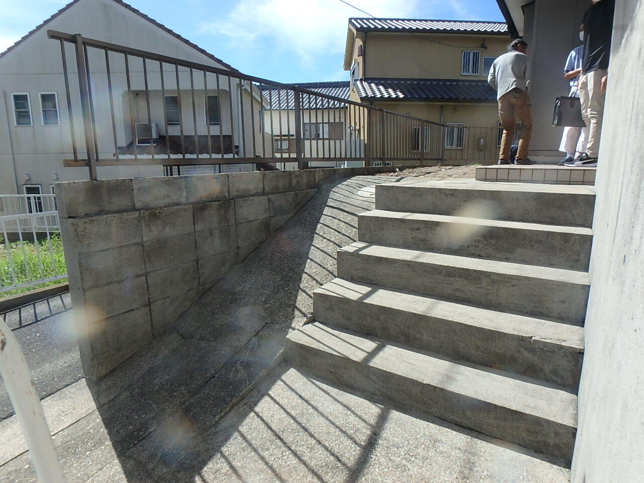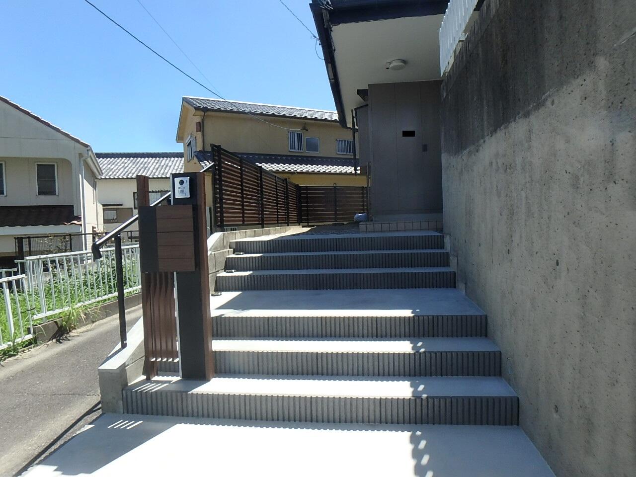 外構工事を行いました。 施工前は急な階段とスロープにより常に気を使いながら昇降されていましたが、階段の幅を広げ、傾斜を緩やかにすることで安心して使用して頂けることができました。 また将来の為に手すりを設置し、モニターホンとポストと表札を兼ねる機能門柱を設置することで使い勝手も見た目もすっきりしました。