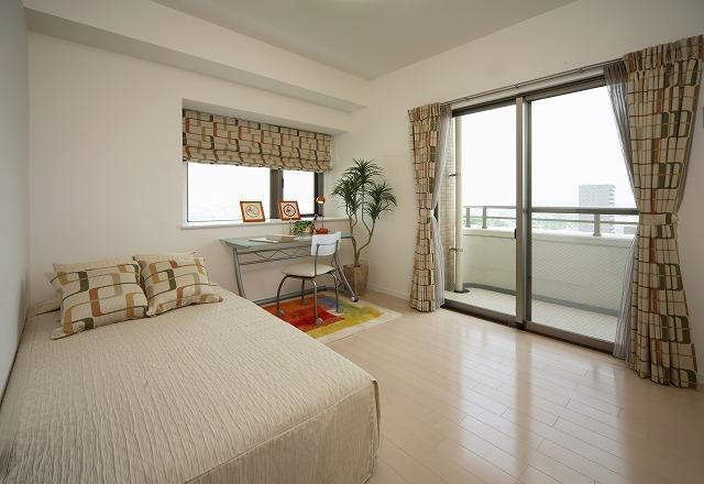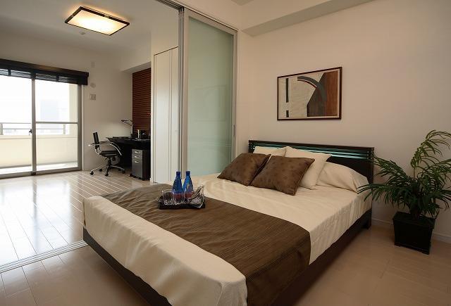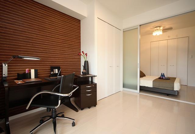 書斎に隣接する寝室は、可動間仕切りで仕切り、開放的な雰囲気に