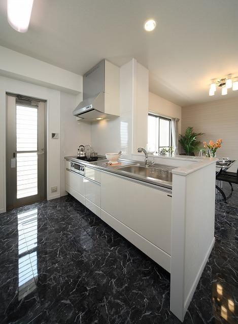 黒の石目調のフローリングを採用したLDK、鏡面ホワイトのキッチンとのコントラストがスタイリッシュ