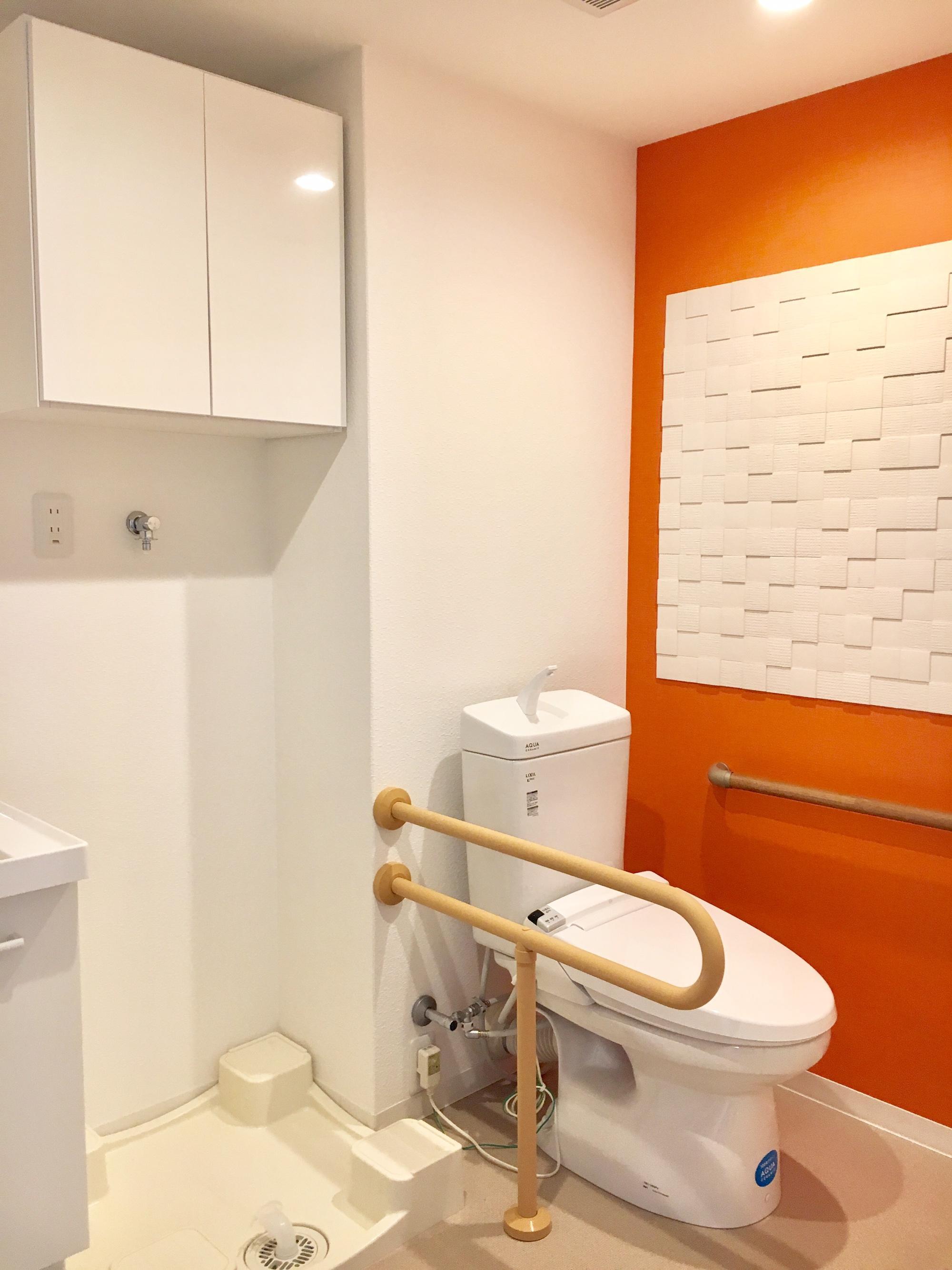 将来介助が必要になった時も、介助者と一緒でも動きやすいよう、洗面室とトイレを一体化し、そのまま浴室にいけるよう導線を考えてプランしました。また壁面には明るいアクセントクロス+エコカラットで、脱臭・湿度もコントロールし、快適で爽快なトイレ空間のご提案です。