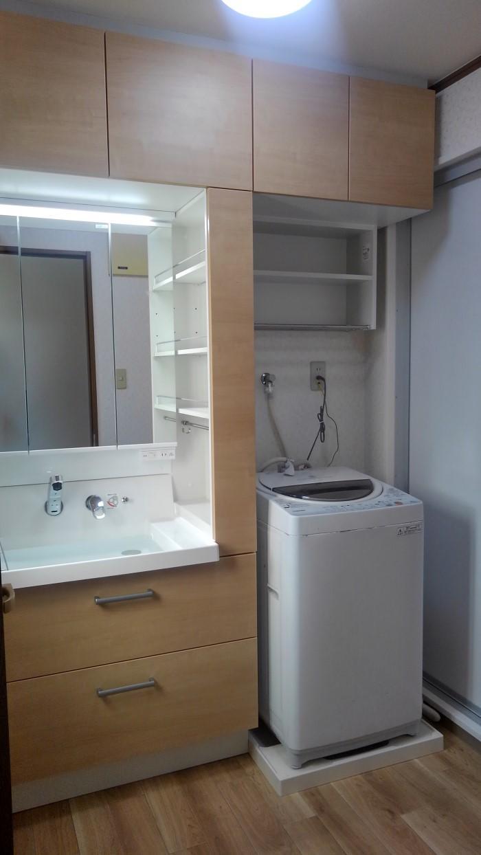 洗面台はLIXIL ピアラ フルスライドタイプ サイド収納付 3面鏡ミラーキャビネット、LEDスリム照明付きです。間口いっぱいに吊戸棚を設置し、洗濯機の上にもオープン収納。洗剤を置くのに便利ですね。痒い所に手が届く収納で、毎日の家事もスムーズになりました!