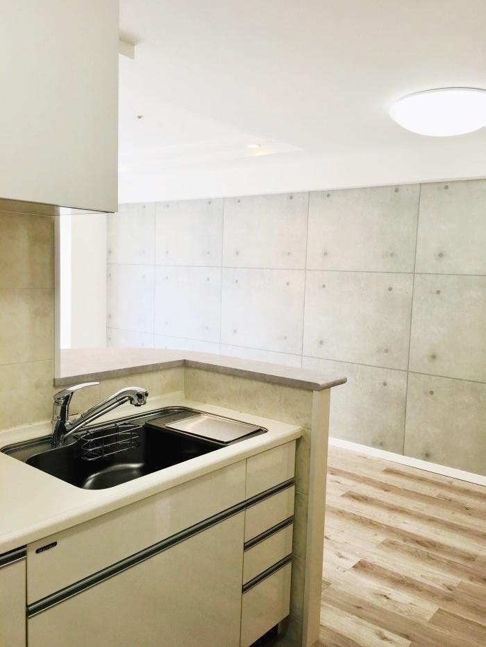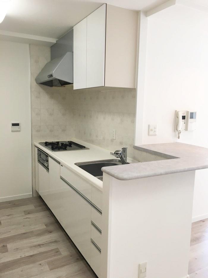 築15年のマンションをご購入され、ご入居前のリフォームでした。メインは内装の張替えですが、キッチンの吊戸&垂れ壁を一部撤去して、解放感あるキッチンに!洗面台は、カウンターのみキッチンパネル張りでリメイク等、上手にコストダウンをはかりました!シンプルだった内装が、お客様のセンスで、シンプルな大人の空間になりました。