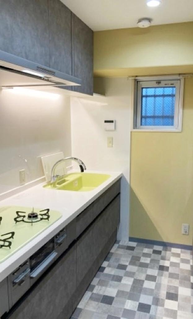アクセントとして「エコカラット」グラナスルドラをお貼りし大切な弓具をインテリアとして飾るご提案もさせていただきました。キッチンは「シエラ」シンクのカラーやクッションフロアはお客様セレクト。差し色にパッと目が行く空間のキッチンになり、思いがたくさん詰まったリフォームとなりました。