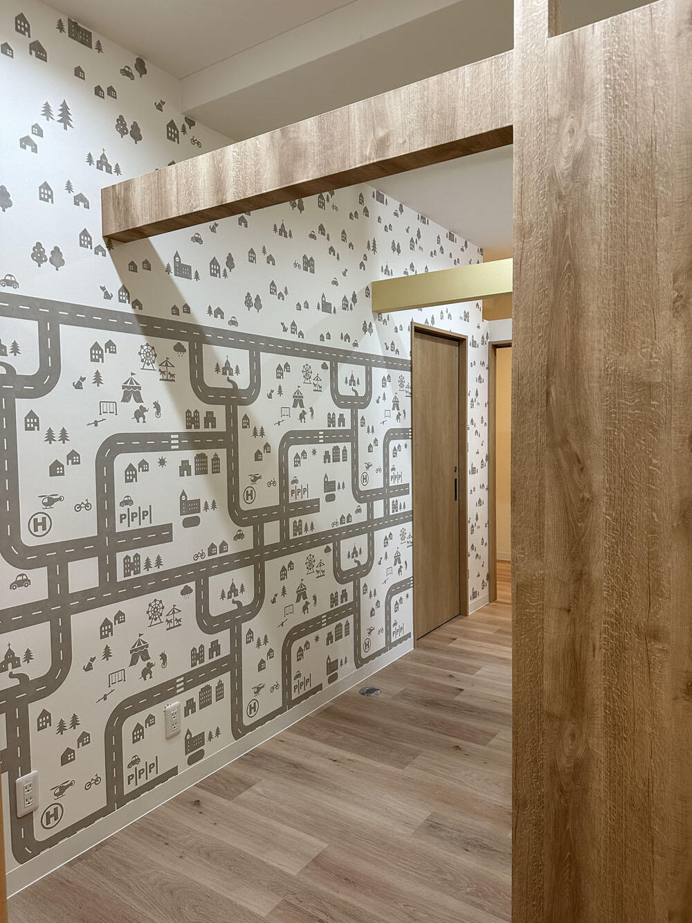 子供さんの待ち時間も想定されるため、道をたどって遊べるようなクロスを張りました。