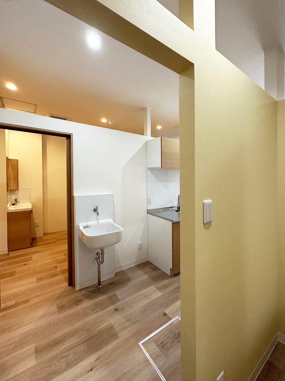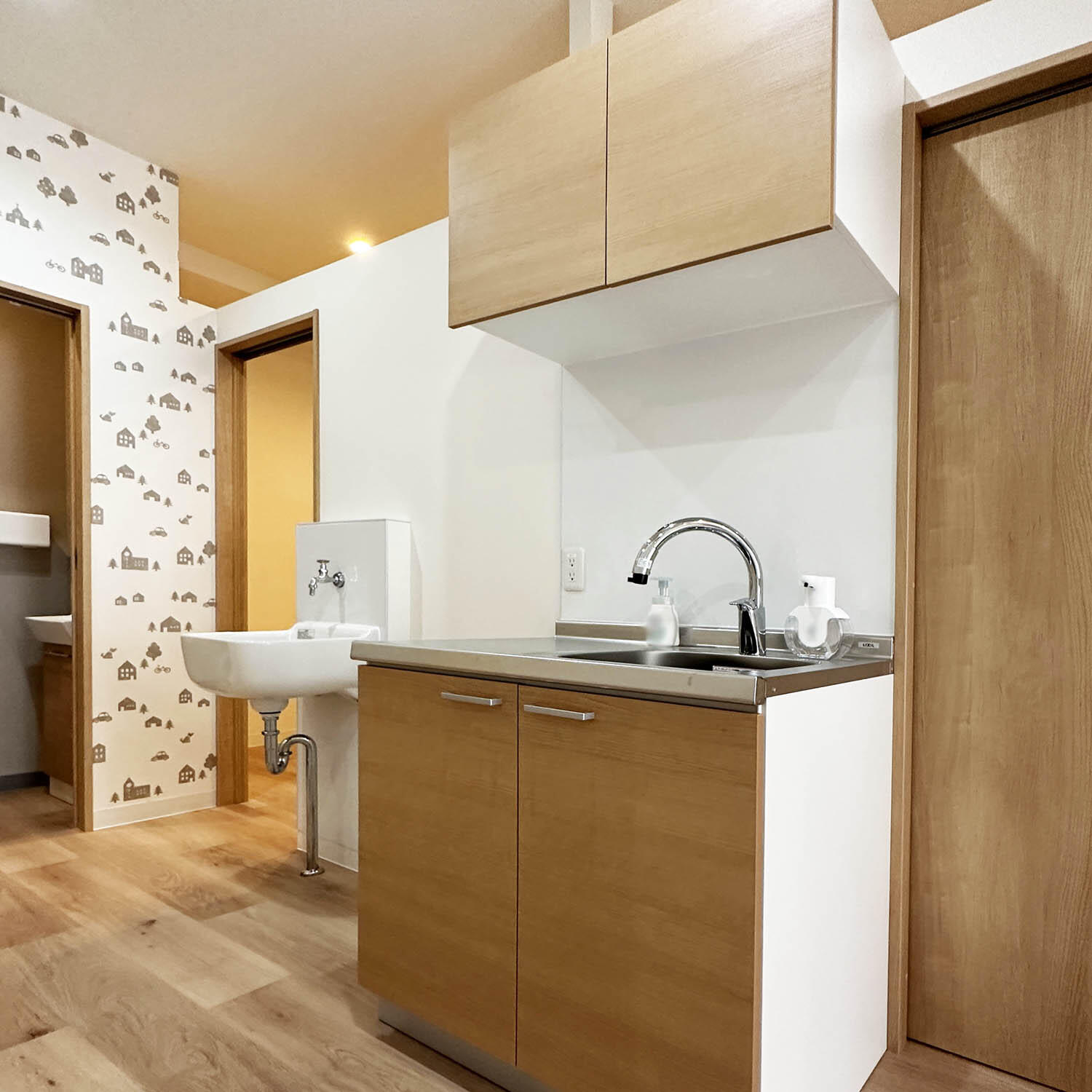 スタッフが働くエリアに省スペースのミニキッチンを設置。扉のカラーを空間と調和させて、使いやすい場所に違和感もなく設置することができました。