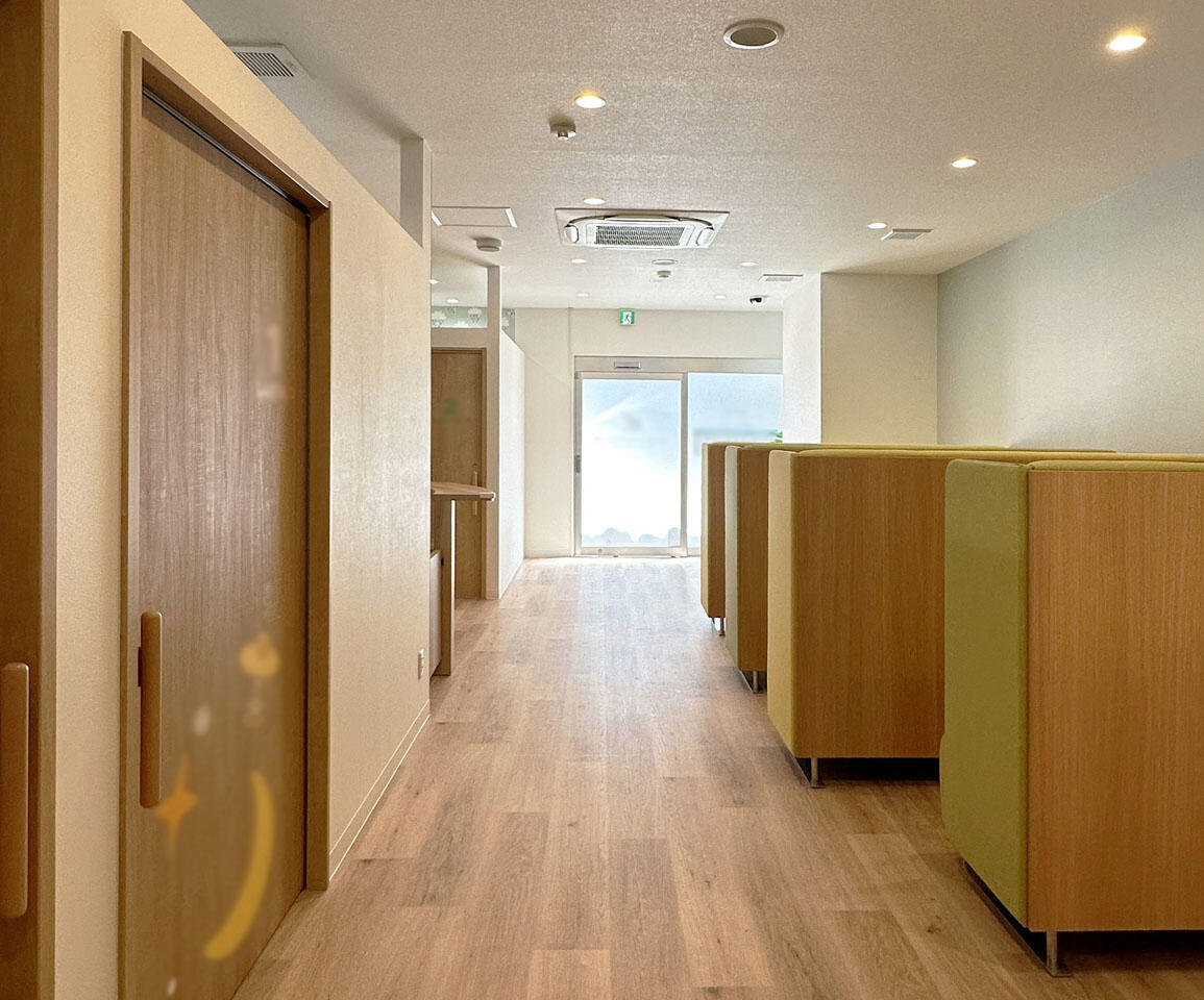 すばやく医療備品や書類等を持って移動できる通路。イエローのクロスも使いながら、ナチュラルで開放感もある空間。