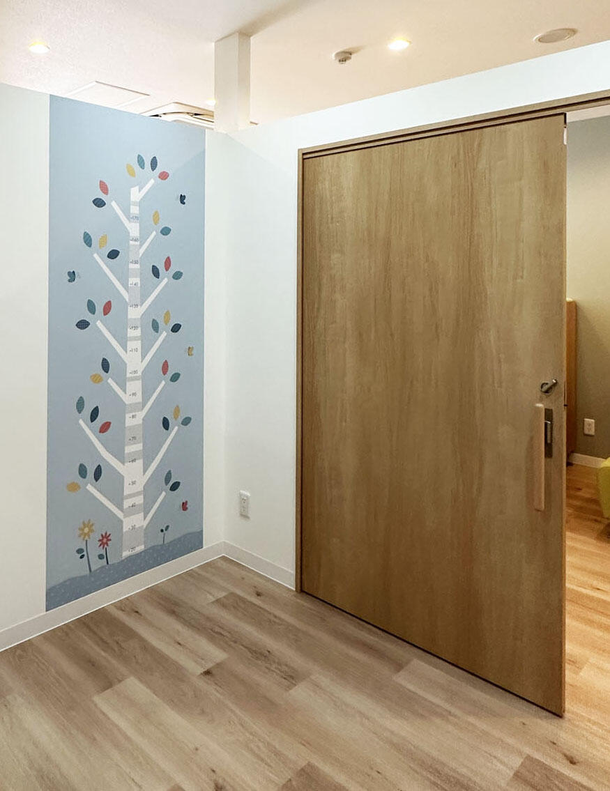 ツリー柄の数値目盛りがついた楽しいアクセントクロスを張り、怖がらずに入れる診察室を目指しました。