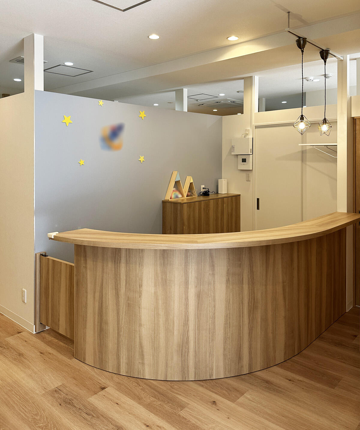 大きな丸みのあるカウンターをお誂えし作成。子供さんをお招きするフレンドリーで安全な受付カウンターができました。