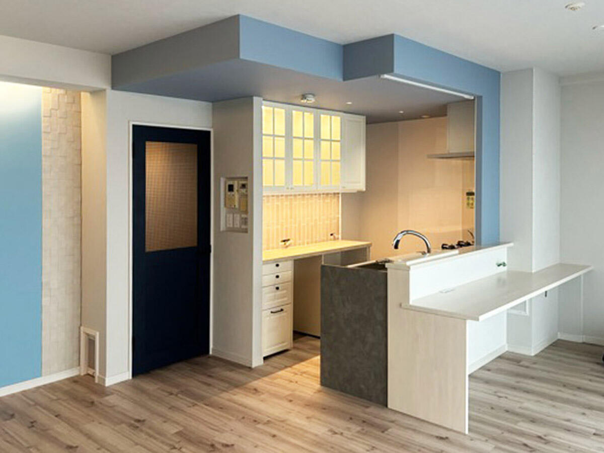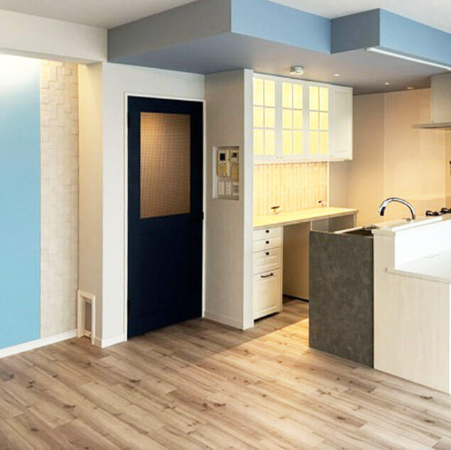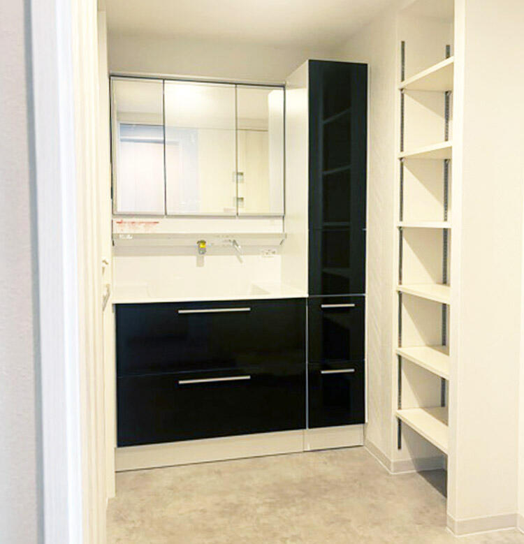 収納スペース一体型の洗面台を採用し、キッチンとの界壁を調整して可動棚を設置しました。カラーもモノトーンですっきりとした清潔感のある空間になりました。