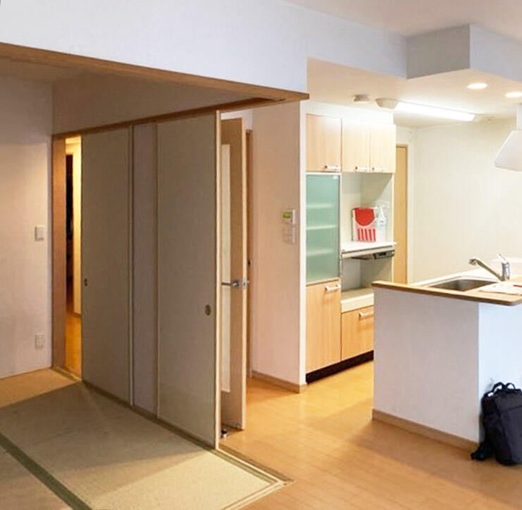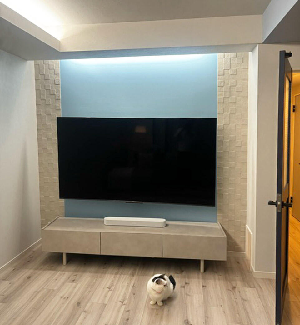 和室をリビング空間に取り込み拡張。エコカラットやアクセントクロス、間接照明などを採用し、ミッドセンチュリー、50Sのポップなアンティークアイテムが似合うリビングができました。ご希望のイメージがしっかりあって、とても素敵なセンスをお持ちのお客様でしたので、私たちスタッフも楽しくお打合せをさせていただきました。