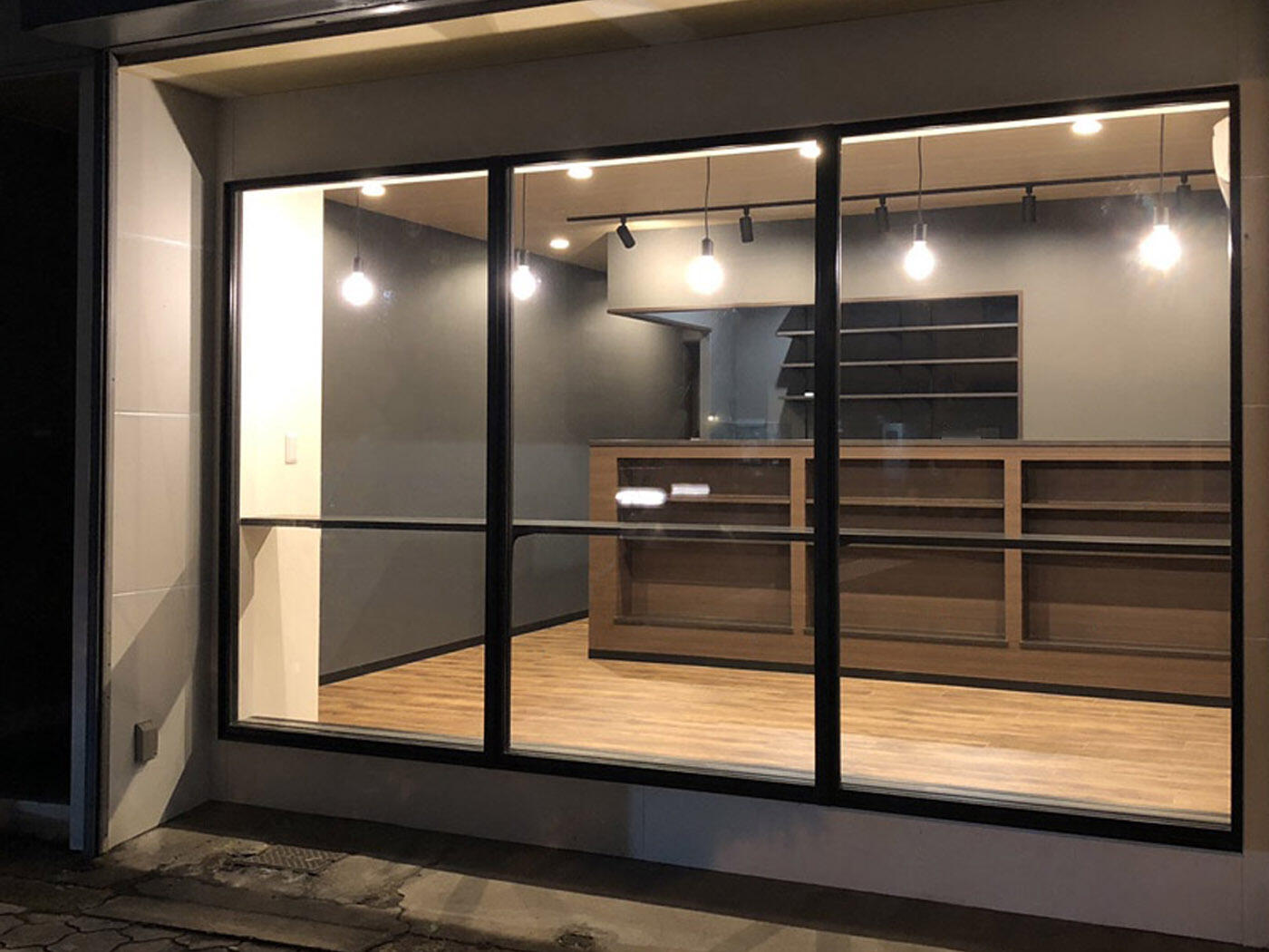 道路に面する建物で路面電車が見えるロケーションを活かし、お客様が座って電車が見えるようカウンター席を配置。店舗とガレージ側の界壁は4枚引き込み扉とし、開放するとオープンカフェのようにして使うことや、イベント時の店舗への出入りを誘導できます。