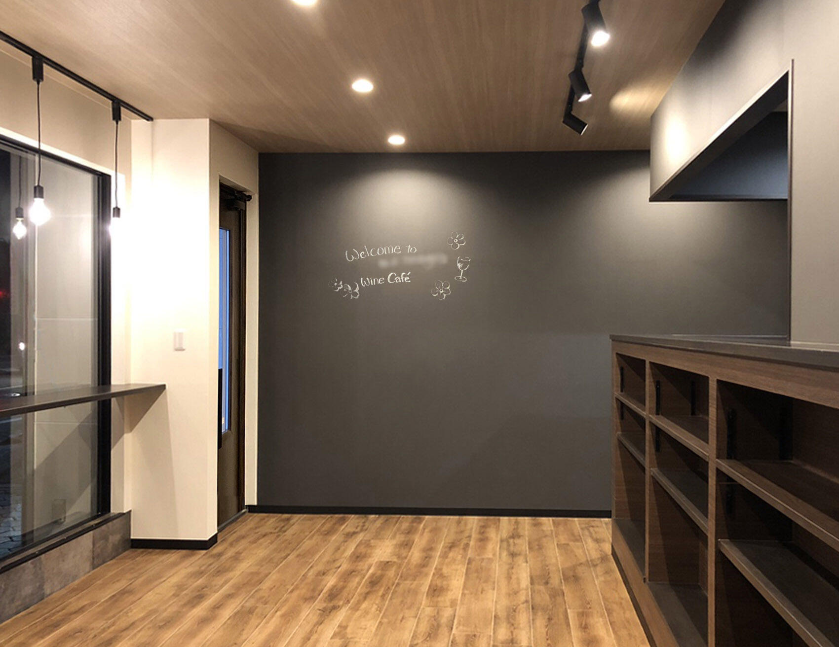 店舗内の黒いクロスはチョークで書ける黒板仕様で、施主様が店舗情報などを自由に記載される計画です。