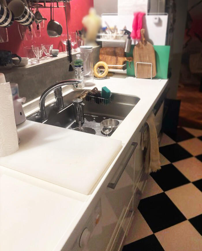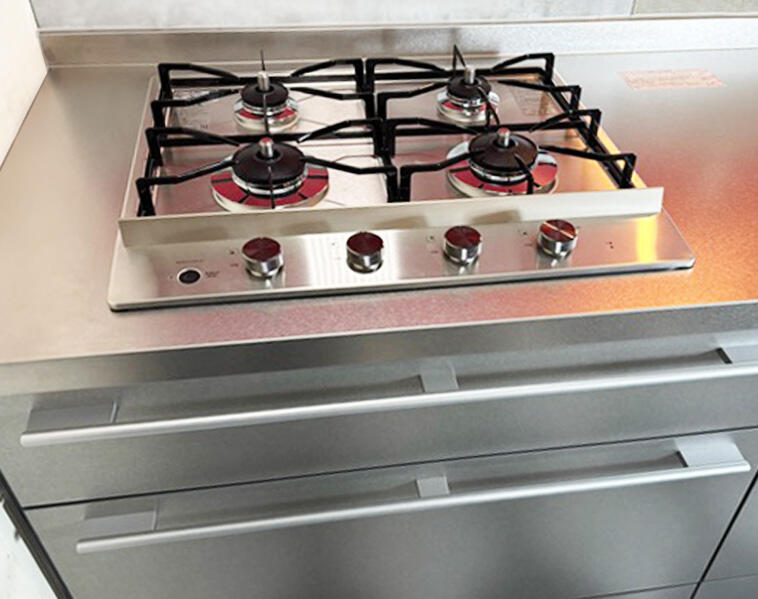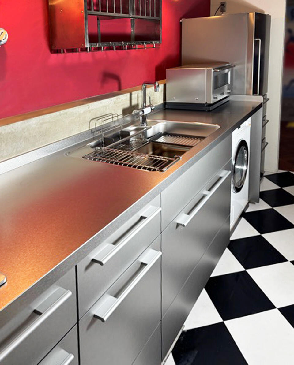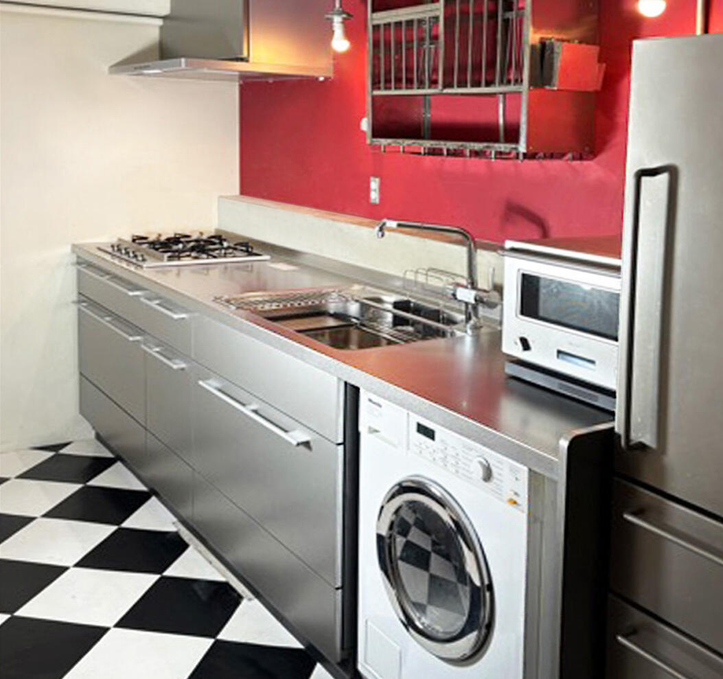 海外のポップな印象のキッチンを嗜好され、カウンターと扉をステンレスで統一し一新し、洗濯機もカウンター下に設置しました。各種配管経路も見極めながら、施主様のご要望に沿ってリフォーム計画と施工。換気扇も汚れが目立ったため、統一の観点からも交換をお勧めさせていただきました。