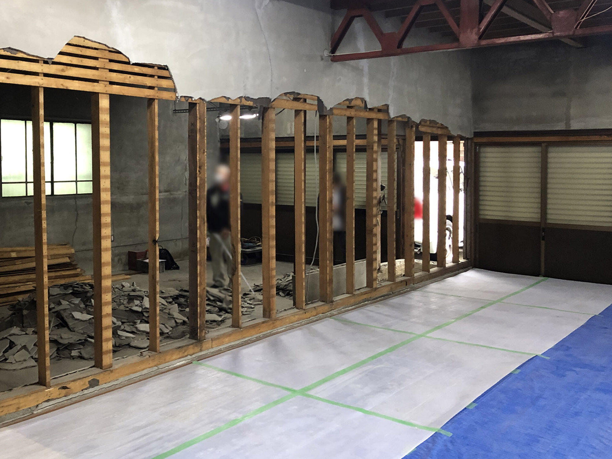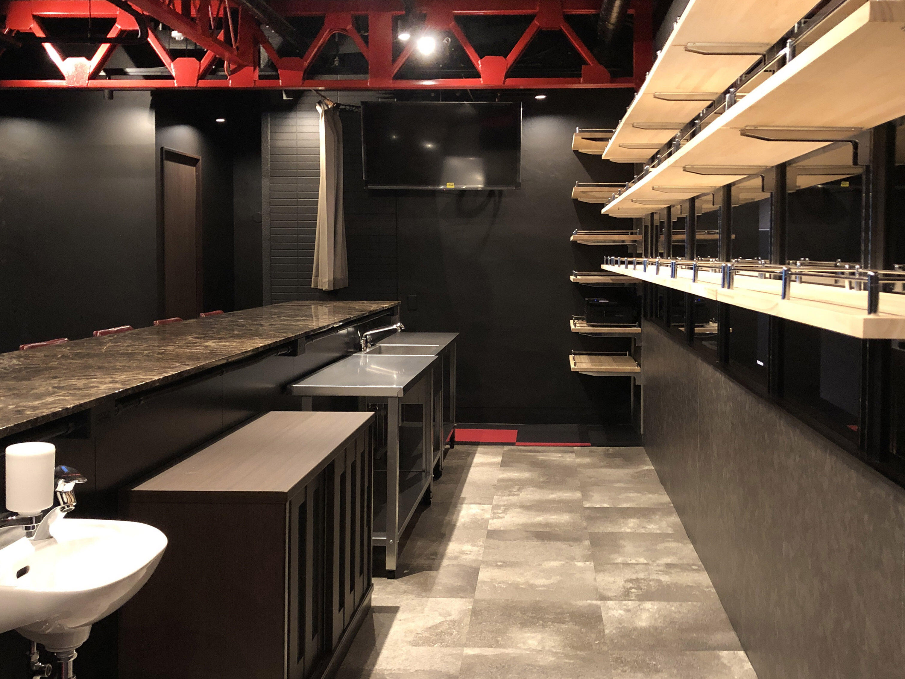 施工完了後の写真。左側カウンターには加熱機器を、右側の棚にはボトルを展示いたします。トラスの梁も真っ赤に塗装し空間のアクセントになりました。