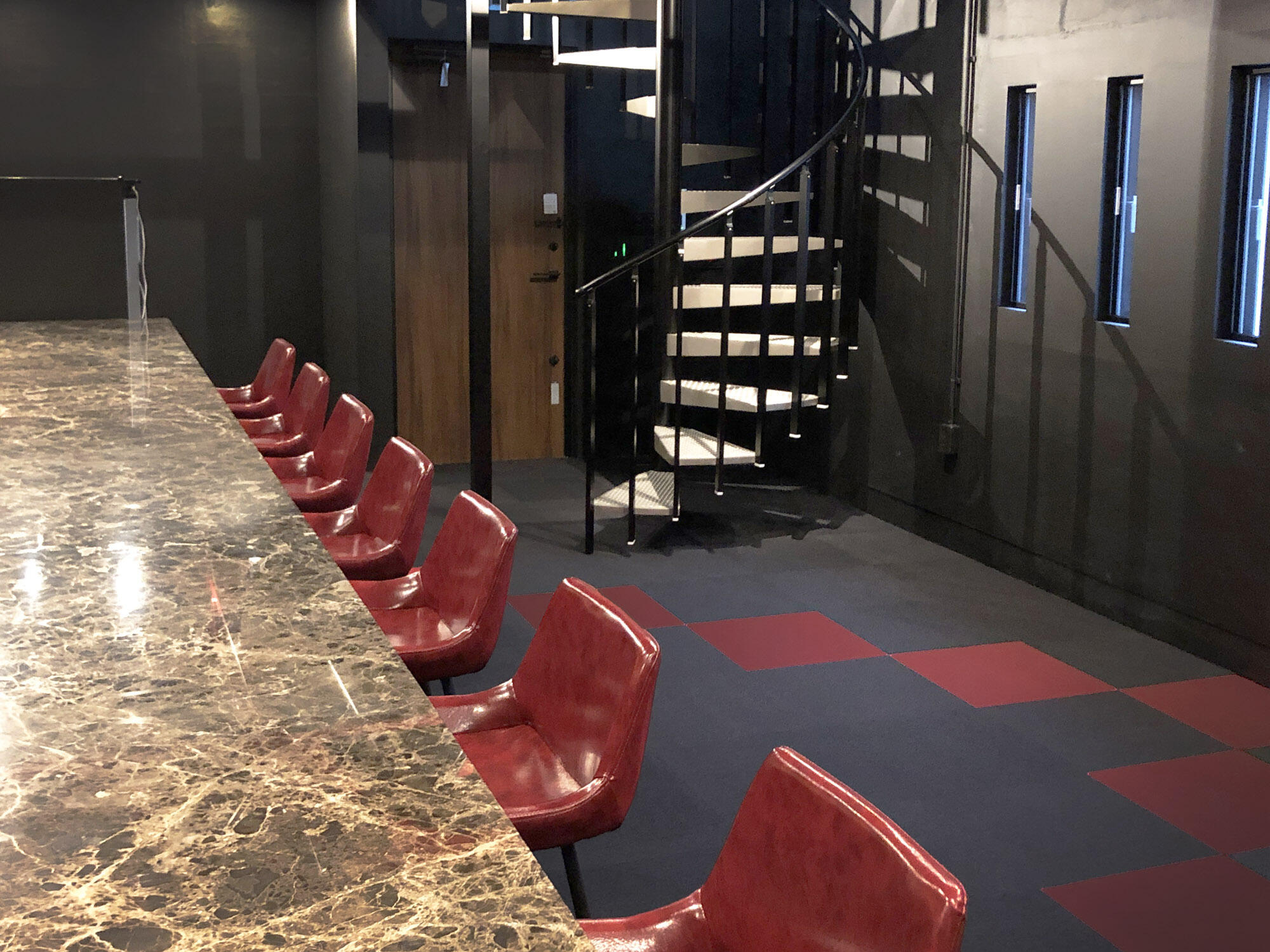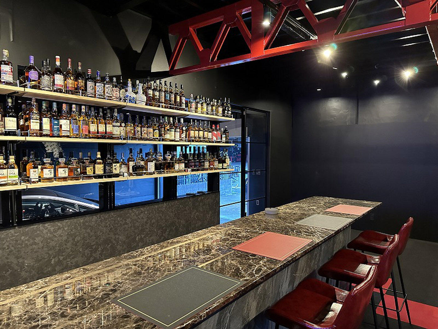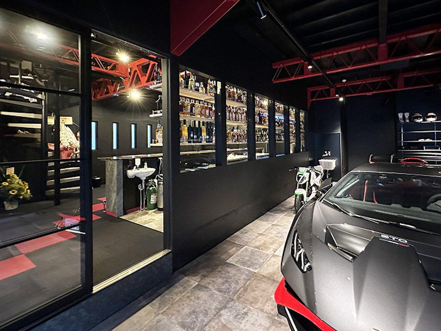 ブラック基調の空間で、バーカウンターに座って駐車した自動車がスポットに浮かび上がる演出。カースペースの床もビンテージ風のフロアタイルを敷き高品位感を向上させるのに役立ちました。