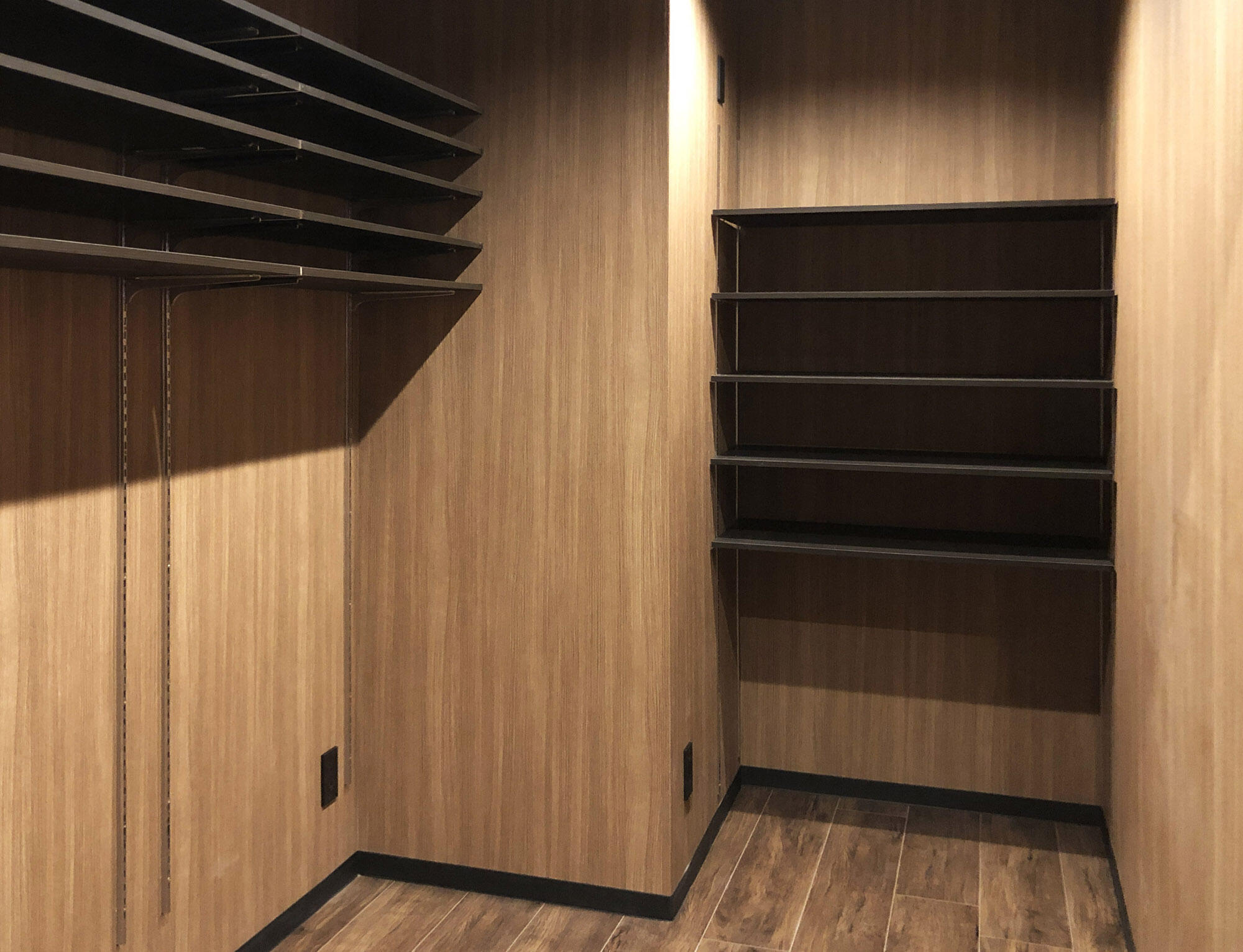 バーカウンターの奥に位置し、清掃用品や各種ボトルストックなどを収納するスペースです。可動棚を複数設置し、フレキシブルに活用できるよう配慮しました。