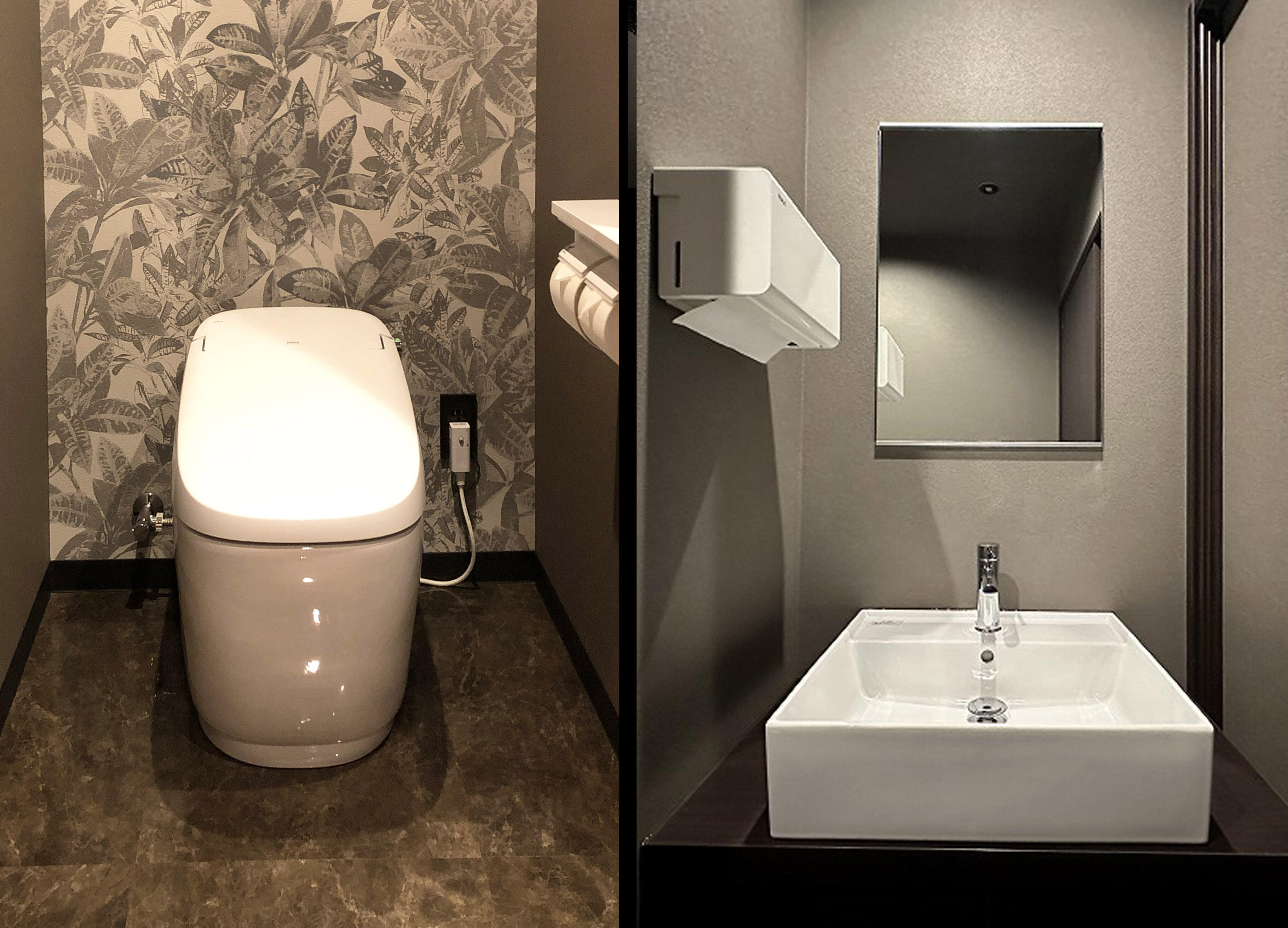 シックで高級な清潔感を目指して、ウォームグレイを基調にしたL型の空間に便器と手洗いを配置しました。
