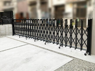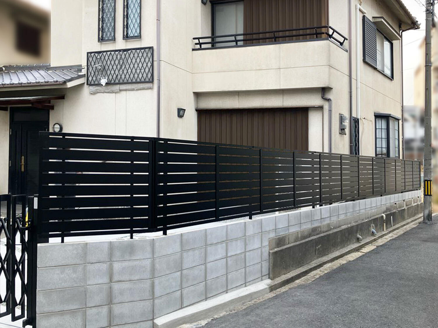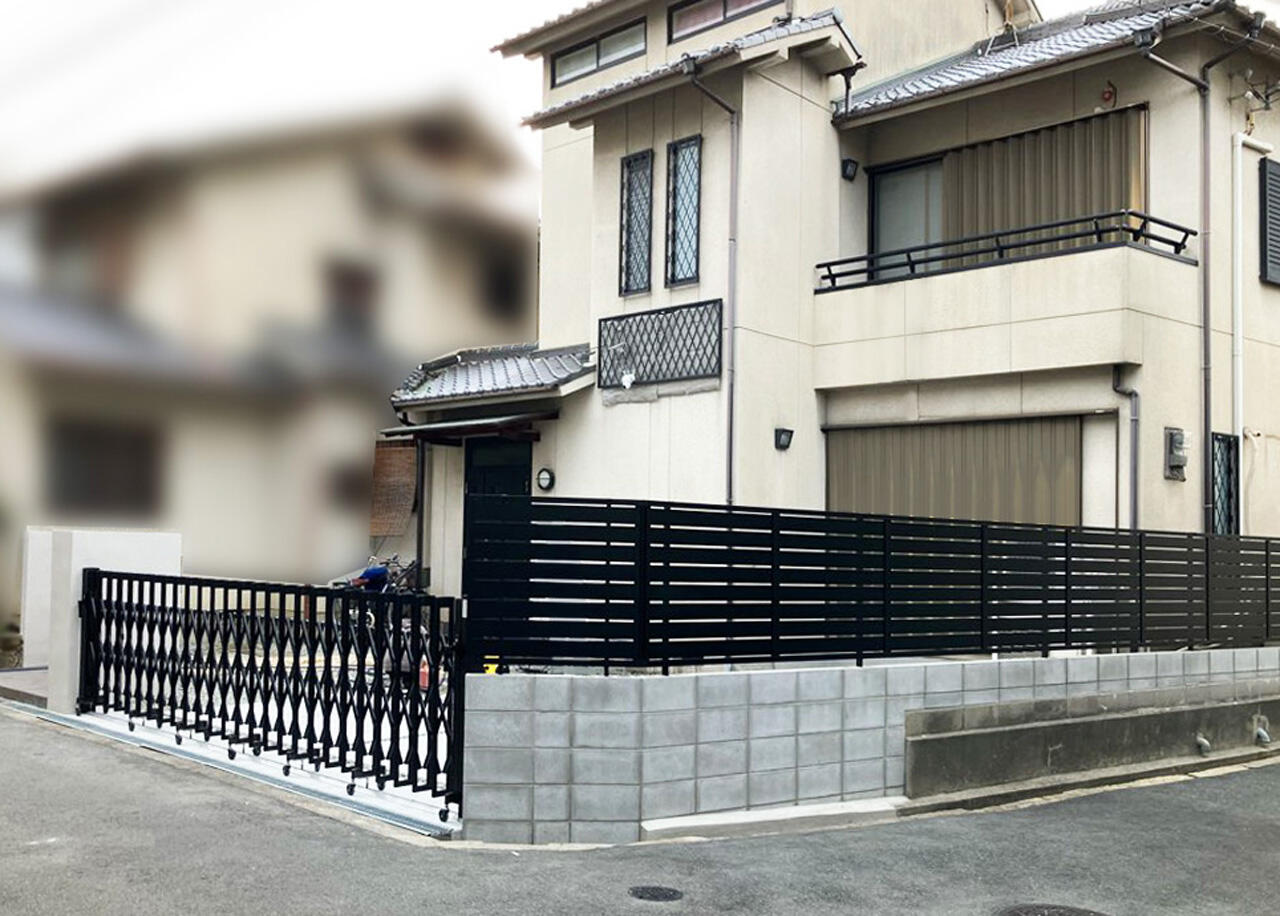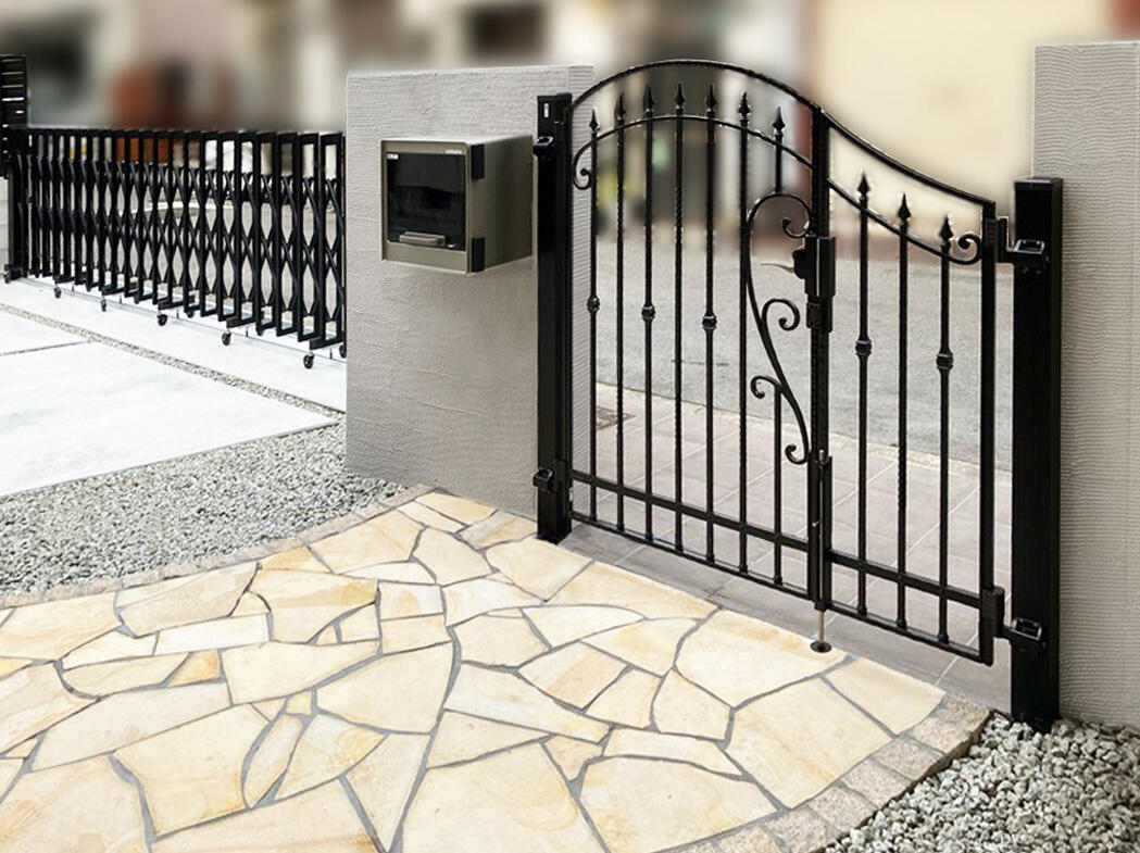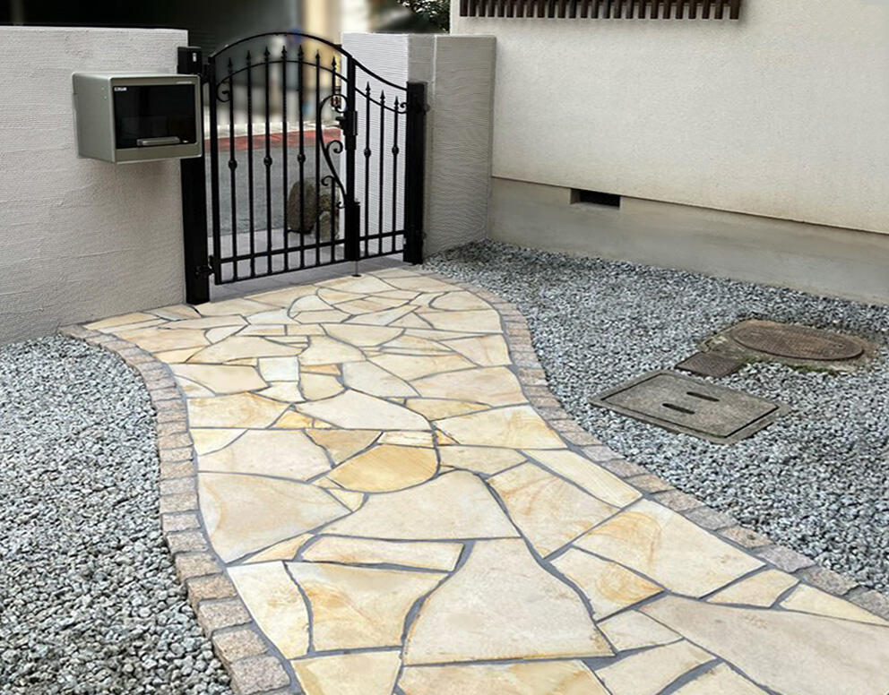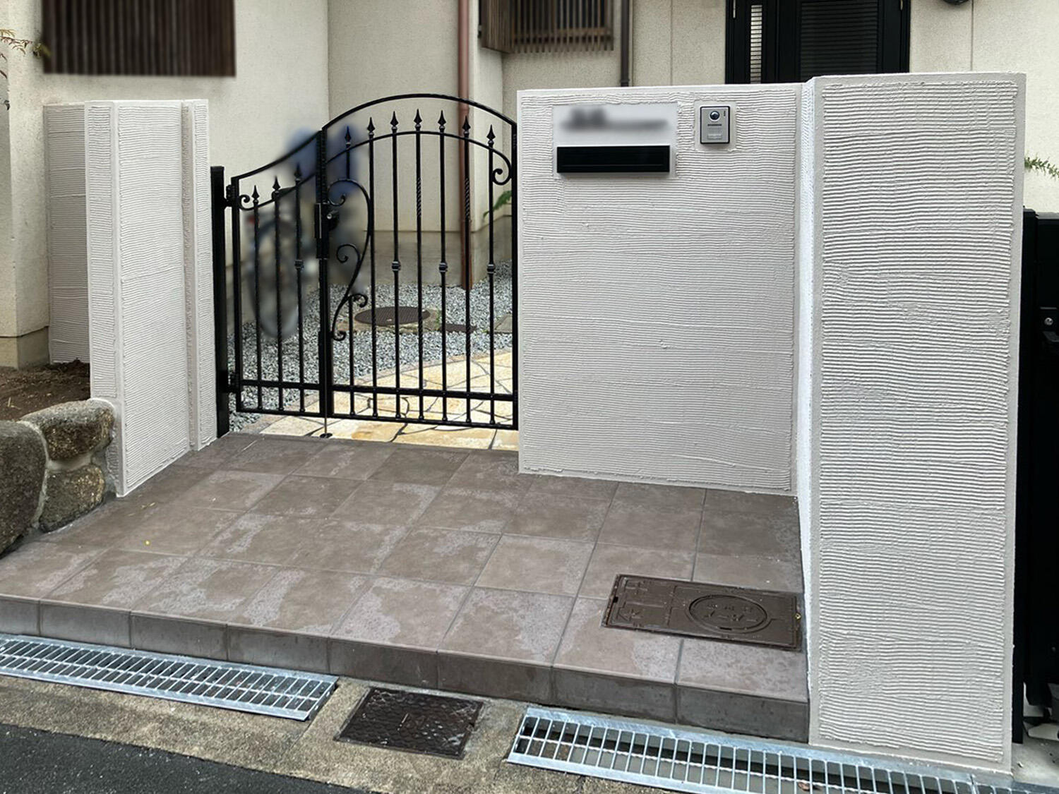 現状のブロック塀の基礎部分はしっかりしており、また土留めとして機能しているため、上部を撤去し水平を整えて軽量アルミフェンスを設置。カーゲートは左右どちらからでも開くことができるタイプで1台駐車のときも最小限の開閉で駐車できるように配慮しました。門扉は流麗なデザインをご提案し、アプローチの乱形石と併せておしゃれな印象を与えました。