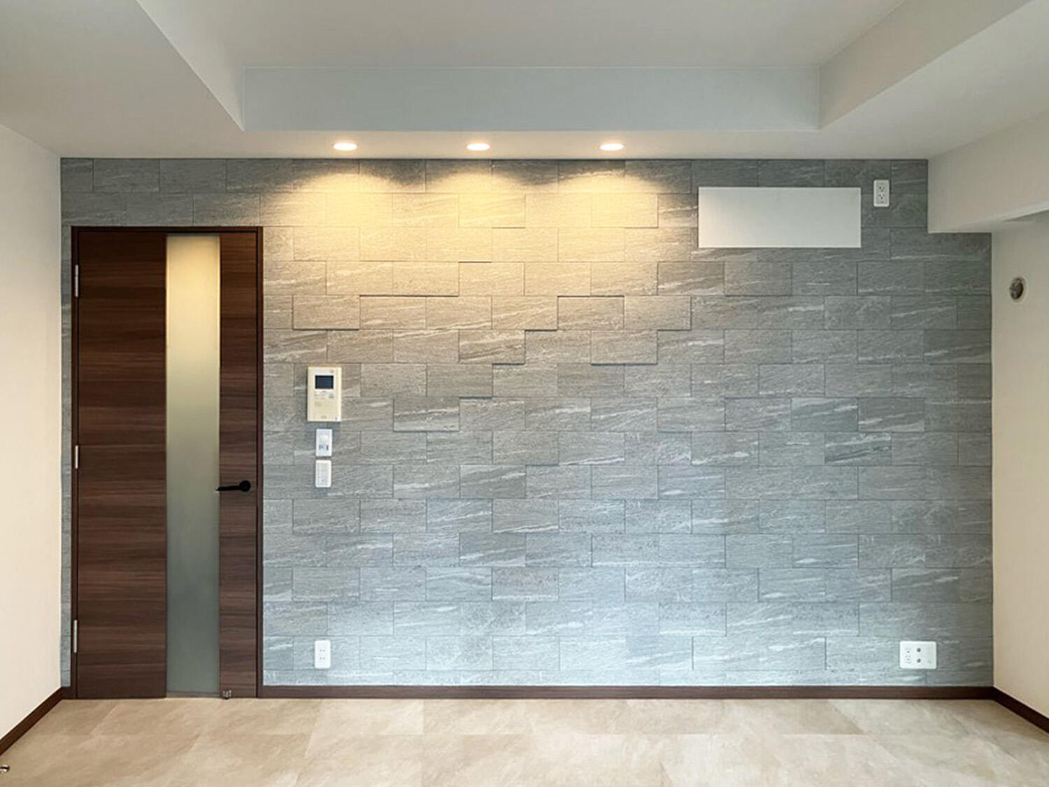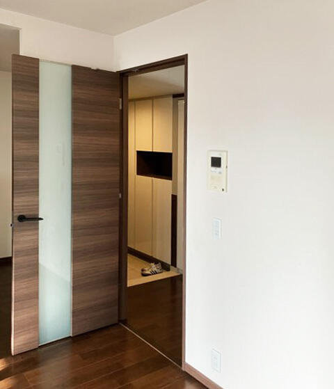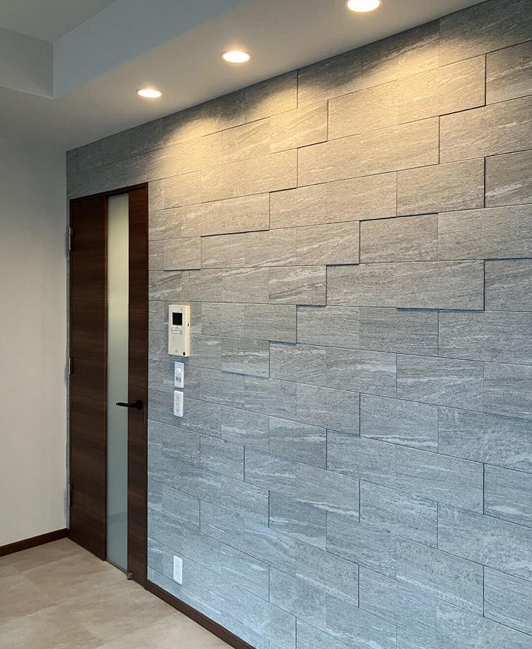 玄関(写真左側)から入って見える廊下壁面にエコカラットを張り、来訪者の視線を誘導し上質にお招きいたします。床面はリビングとも合わせた大理石調のフロアタイルを張り、エコカラットとも調和し重すぎない上質空間になりました
