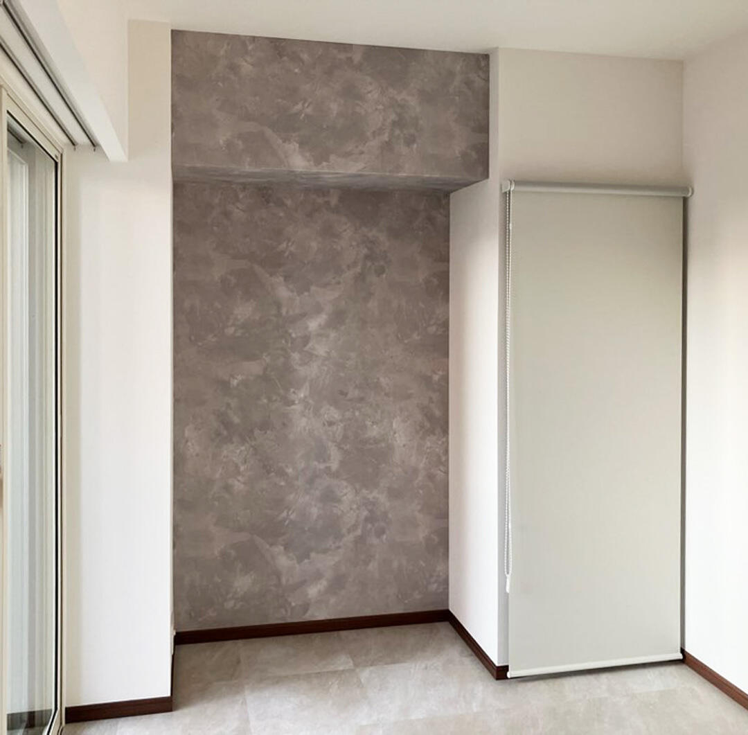 すべての個室床はリビングとも統一された少し明るい大理石調のフロアタイル。主寝室は色味を抑えた石目調のクロスをアクセントとし上質感が生まれ、入り組んだくぼみが少しダークになりお部屋の形もすっきり見えるようになりました。クローゼットの前にベッドを置く構想を持たれていたため、ドアをロールスクリーンに替え、使いやすい空間になりました。その他の個室もそれぞれの使用者の個性あるアクセントクロスを選んで表情を造りました。
