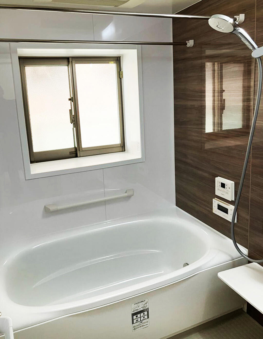 1418サイズのLIXILリノビオ。アクセントパネルには光沢感のあるややダークな木目が選ばれ、そのアクセントがすっきり生きるように浴槽やその他の部分はシンプルにホワイト系で構成いたしました。またミスト付きの暖房乾燥機を選定されました。
