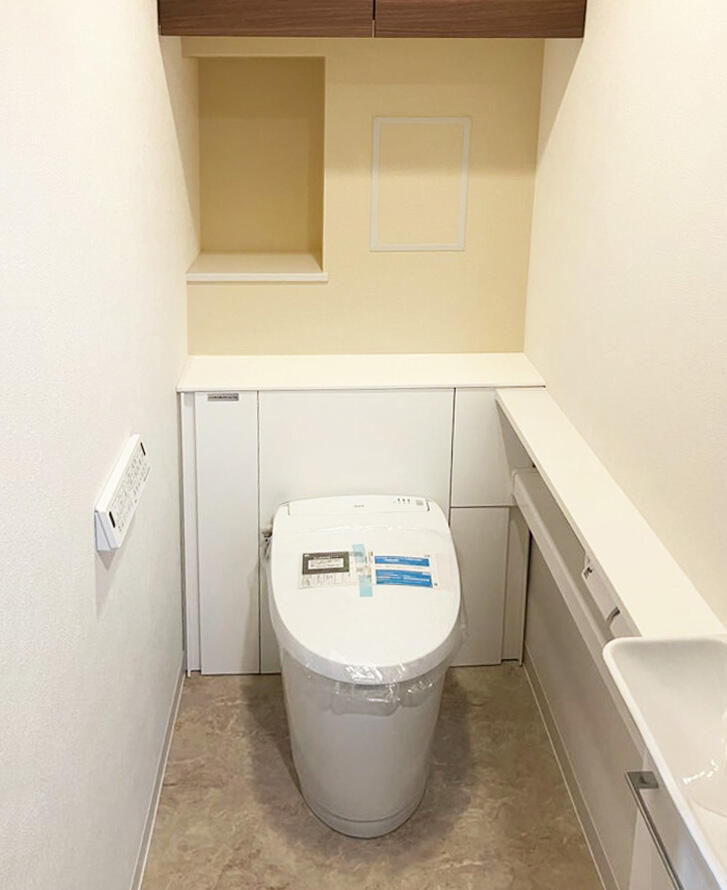 ホワイトを基調にし、小物の収納も可能なキャビネット付きの便器(Jフィット)で清掃もしやすくすっきりした空間になりました。トイレにもイエロー系のアクセントクロスを採用しました。