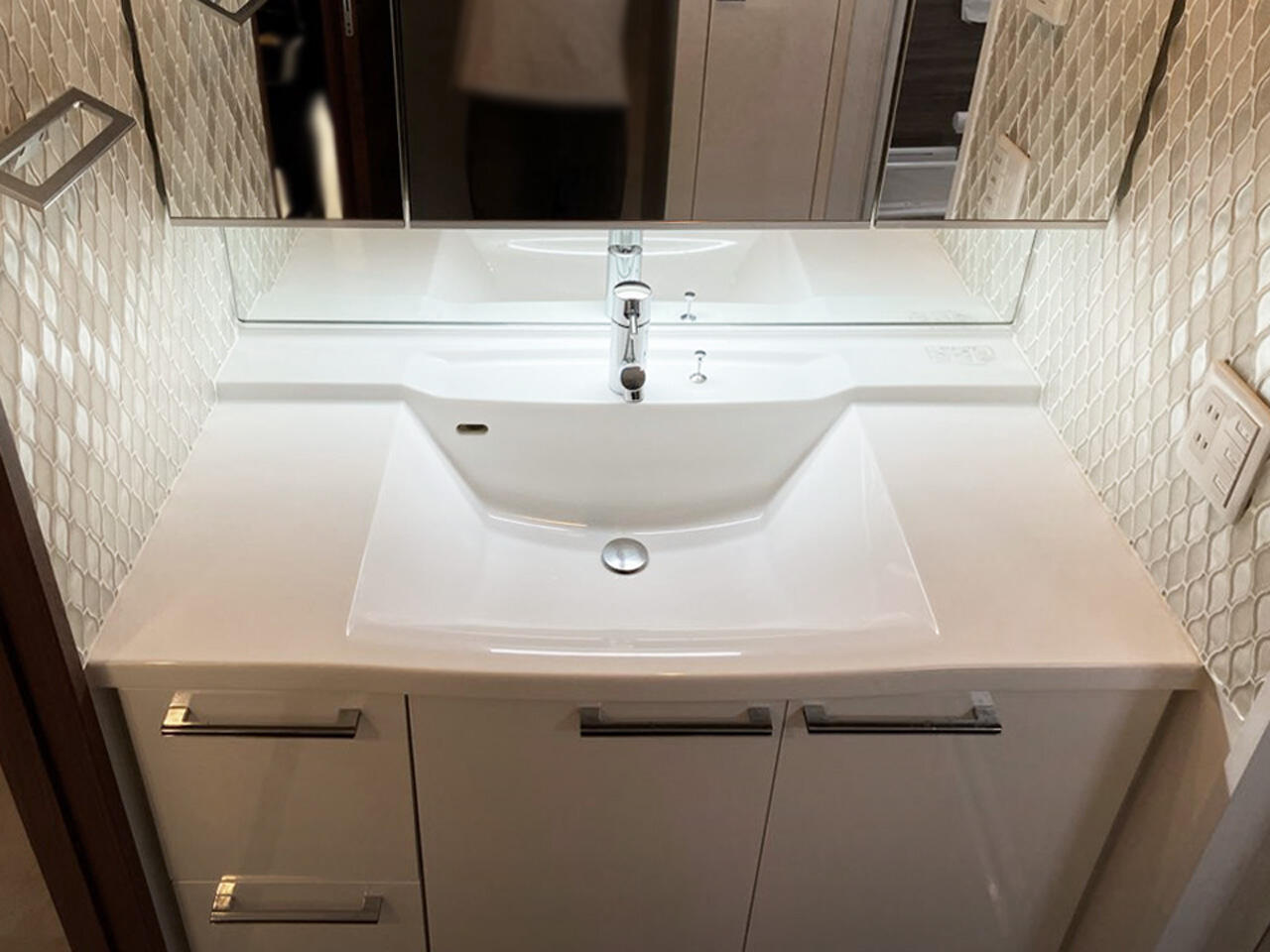 洗面台の左右の壁にガラスタイルを張りました。洗面台は転用ですが磨き上げることで、きらめきと高級感があるおしゃれな洗面空間になりました。
