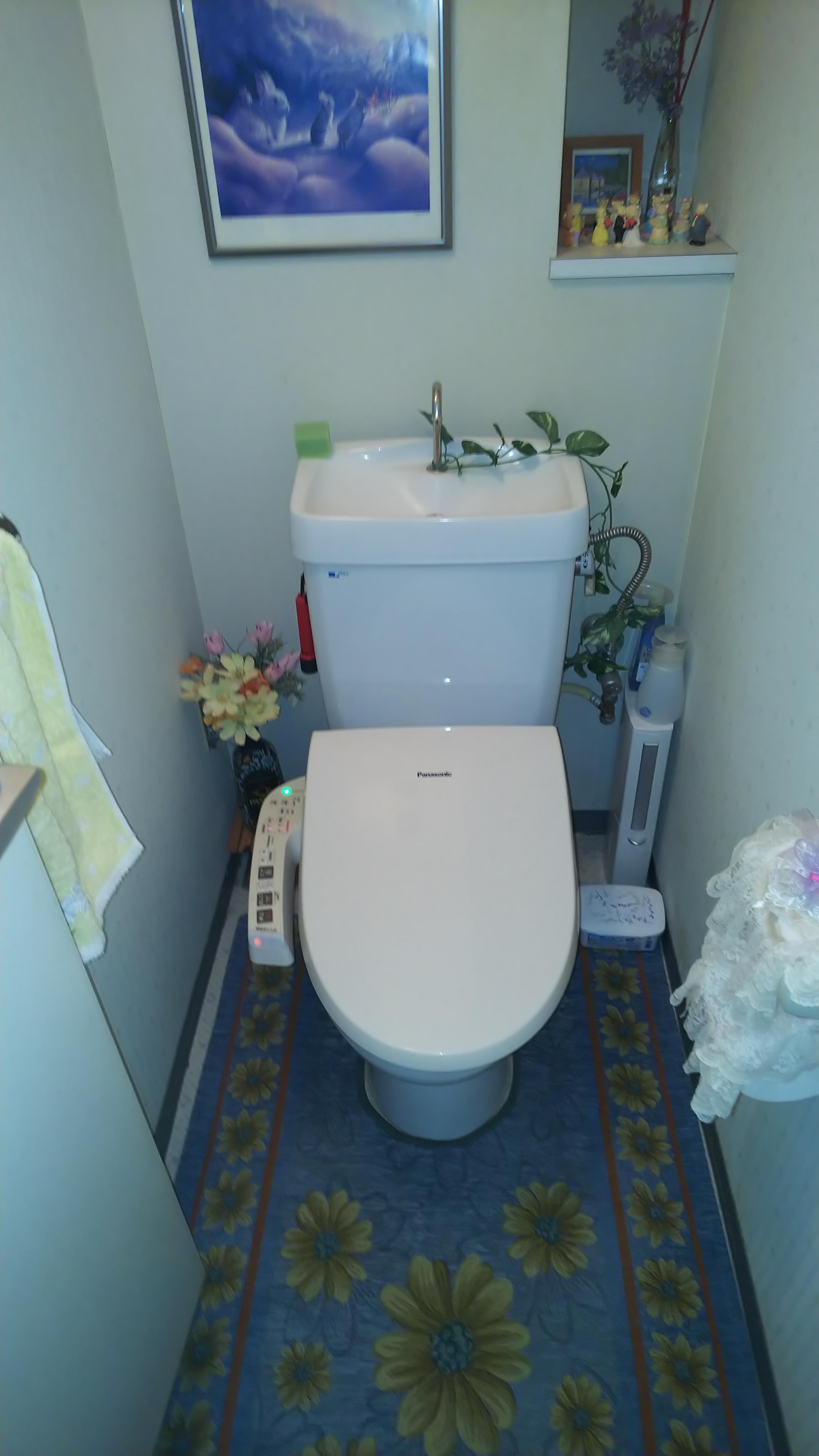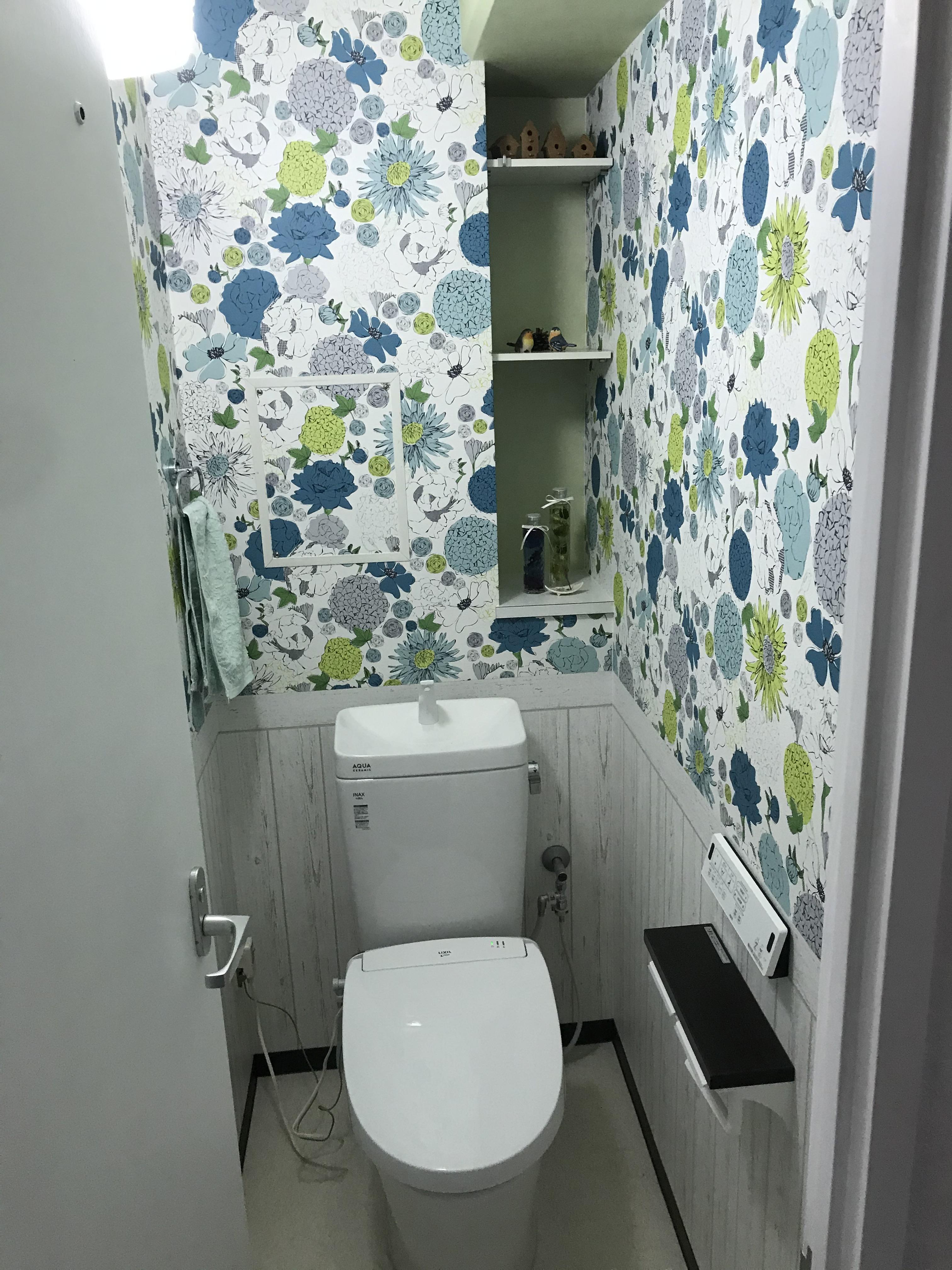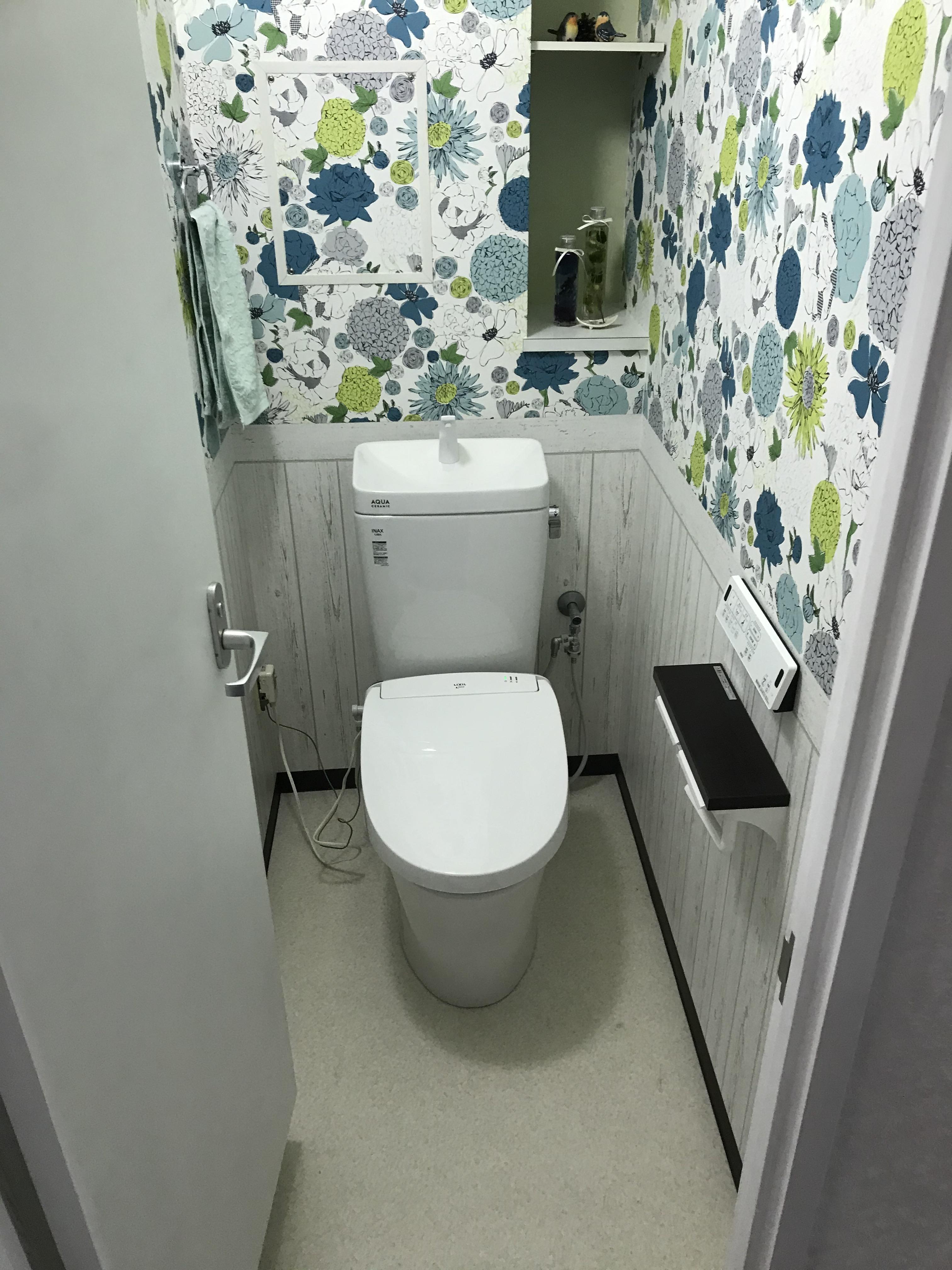 奥様がチョイスされた壁紙は、花柄クロスと木目の腰壁風。 とっても華やかなトイレになりました。 アドバンスの担当者も奥様のセンスの良さにびっくりです(#^.^#)