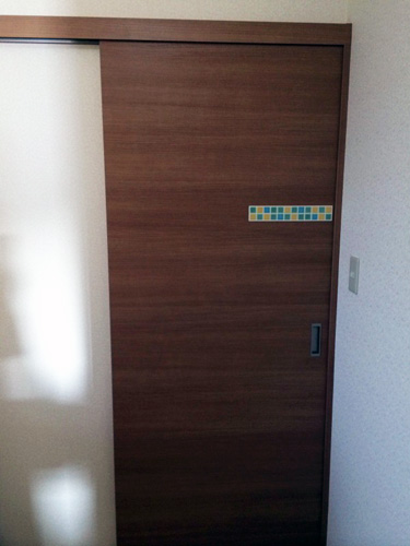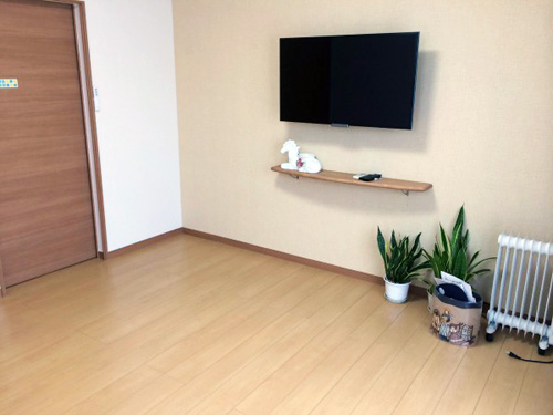 和室が廊下より18cm上がっていましたので、和室側を下げてバリアフリーに。テレビの高さはベッドに寝ても見やすい高さに設定しました。隣が工場でしたので、防音と寒さ対策を行いました。ドアのワンポイントタイルは、家族がおじいちゃんとおばあちゃんの部屋と一目で分かるようにしたくて提案させていただきました。気に入っていただけてよかったです。