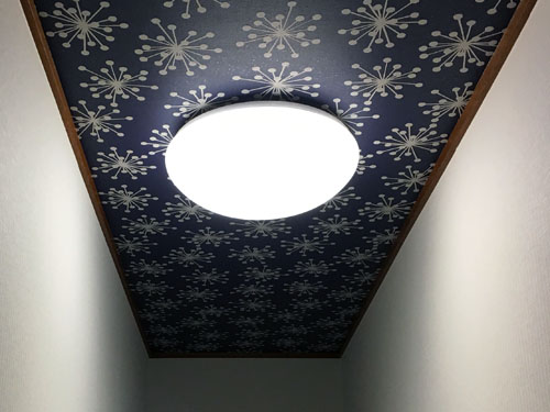 「階段の天井は、ワンポイントで柄のクロスを選びました。空間に変化が出てとても気に入っています。」