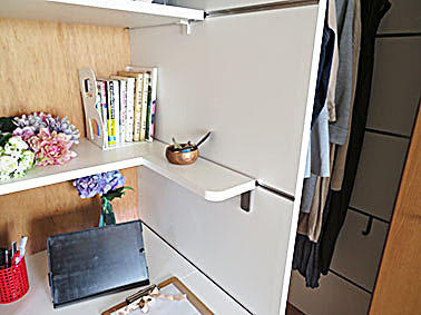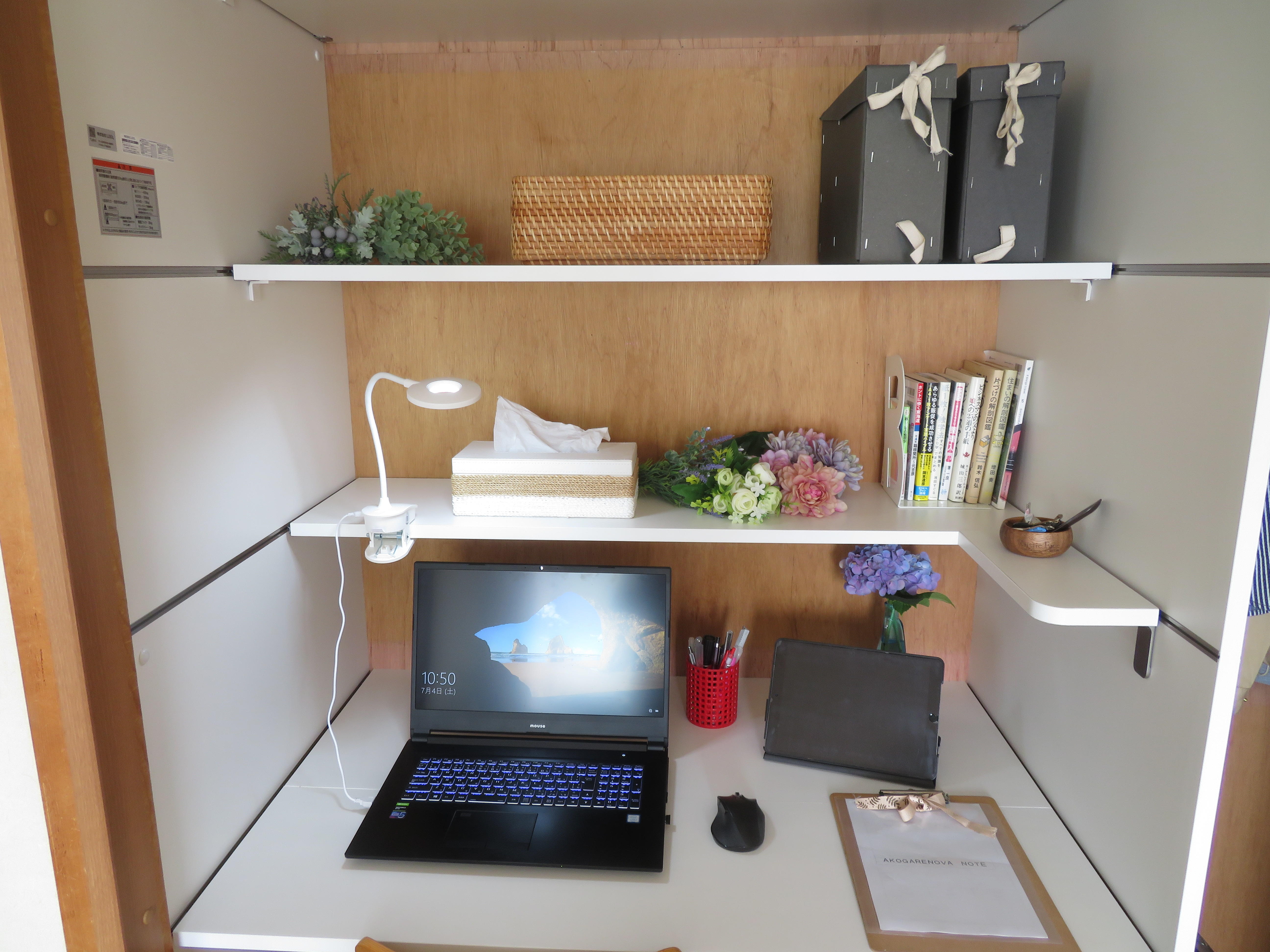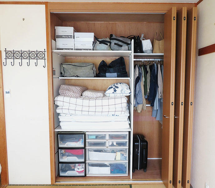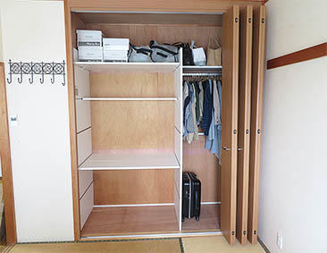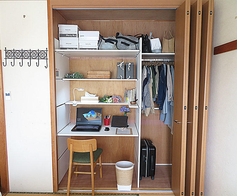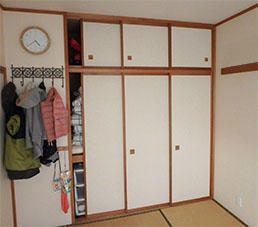 和室の押し入れをクローゼット収納にご希望のお客様。衣類や布団など様々な大きさのものを収納できるクローゼットに改修するだけでなく、ヴィータスパネルを使ってご、将来的にはプチ書斎としても可変可能なスペースになるよう提案。