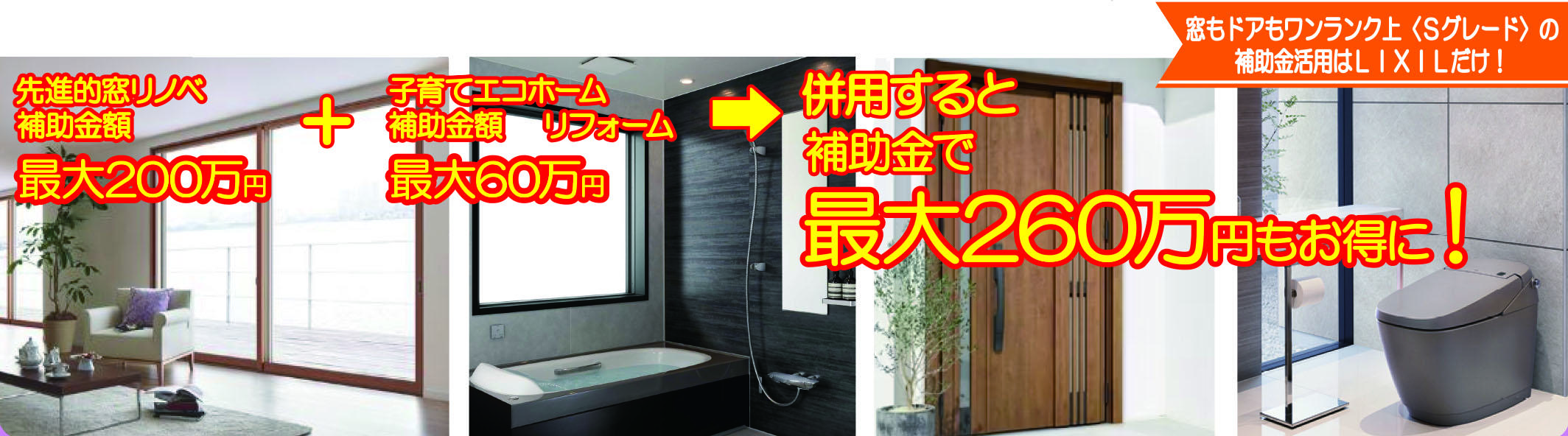 リフォームには国や県、市町村からの補助金制度があります。国からは指定の省エネ商品を取り入れると最高で260万円もお得にリフォーム工事が可能です。ぜひ各補助金登録会社のトップ・ワークスにご相談下さい。