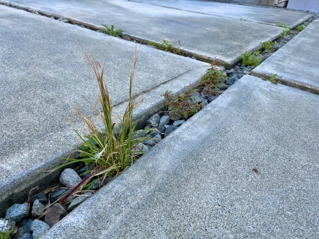コンクリートの小さなすき間から生えてくる雑草。見た目が悪いだけでなく、根が広がることでコンクリートを押し上げ、ひび割れの原因になることもあります。