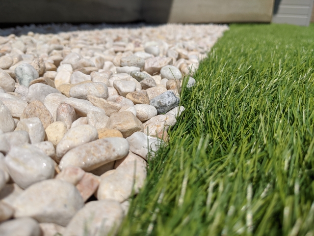 人工芝は日本庭園など和テイストのお庭にもよく合うので、砂利との組み合わせはよく使われます。建物の外周に砂利を敷いて、残りのスペースに人工芝を敷くようなレイアウトも人気です。
