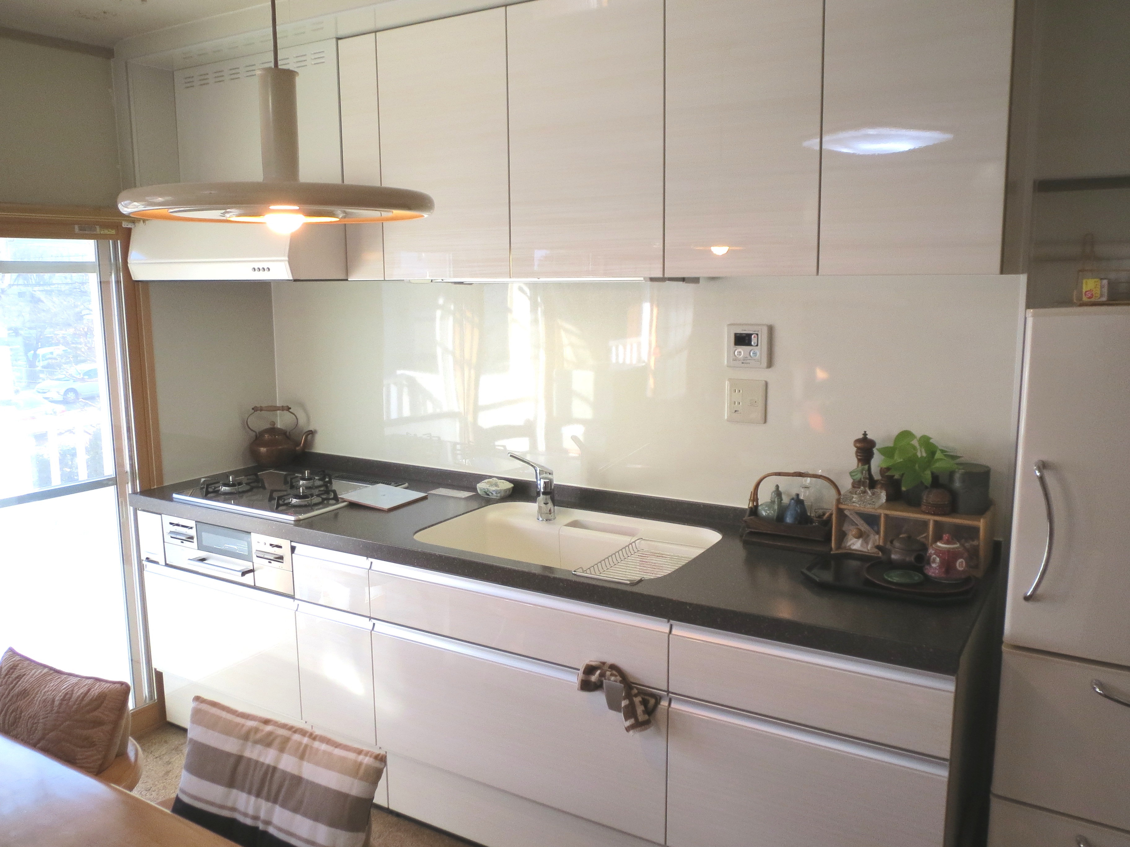 古かったキッチンがこんなに広く綺麗に変わるだけで部屋全体が明るく広々感じます。 キッチンも収納が多く上に物を置かなくなったおかげで、ごちゃごちゃせず、これを維持していこうという気持ちにさせてくれます。