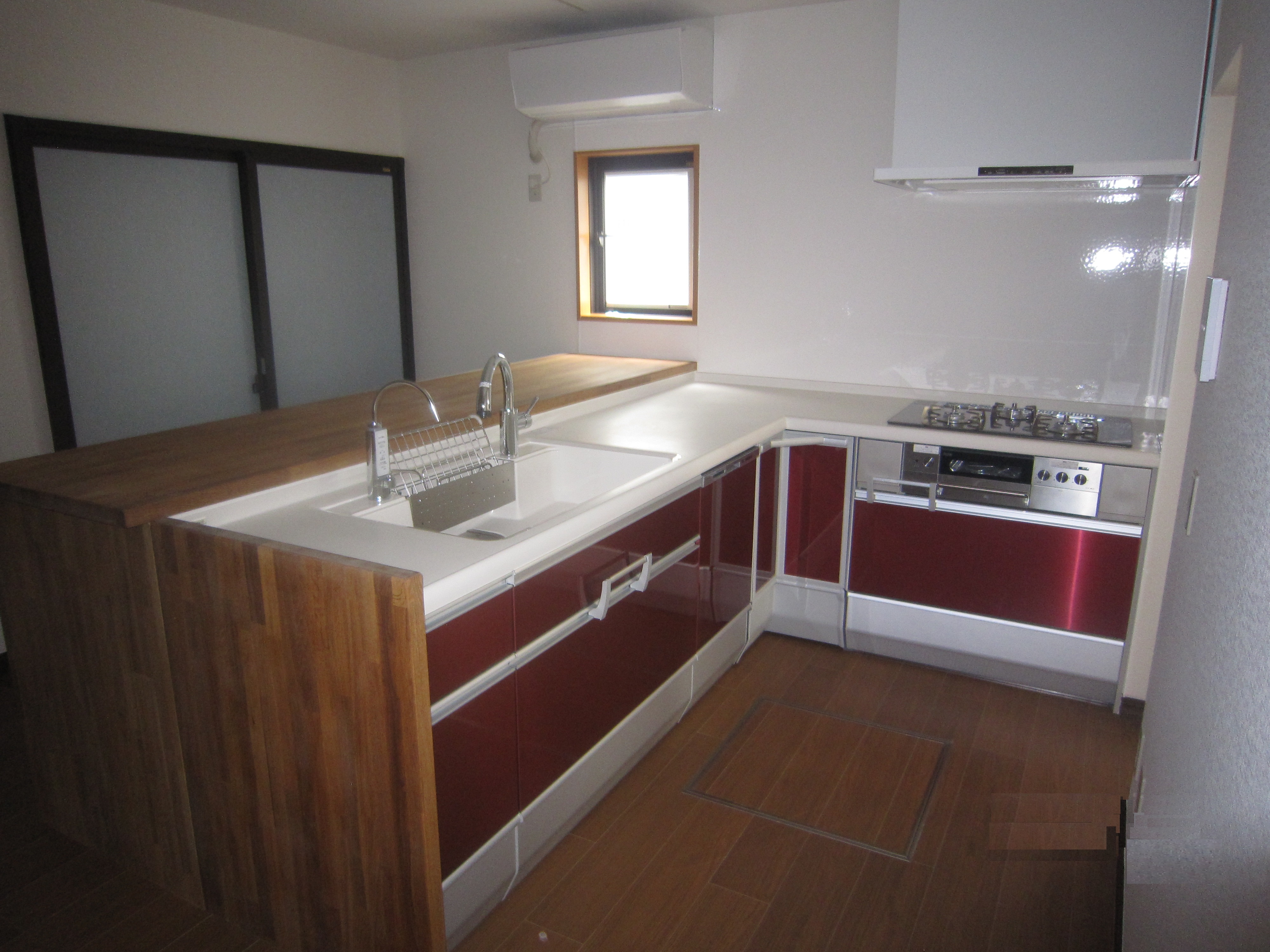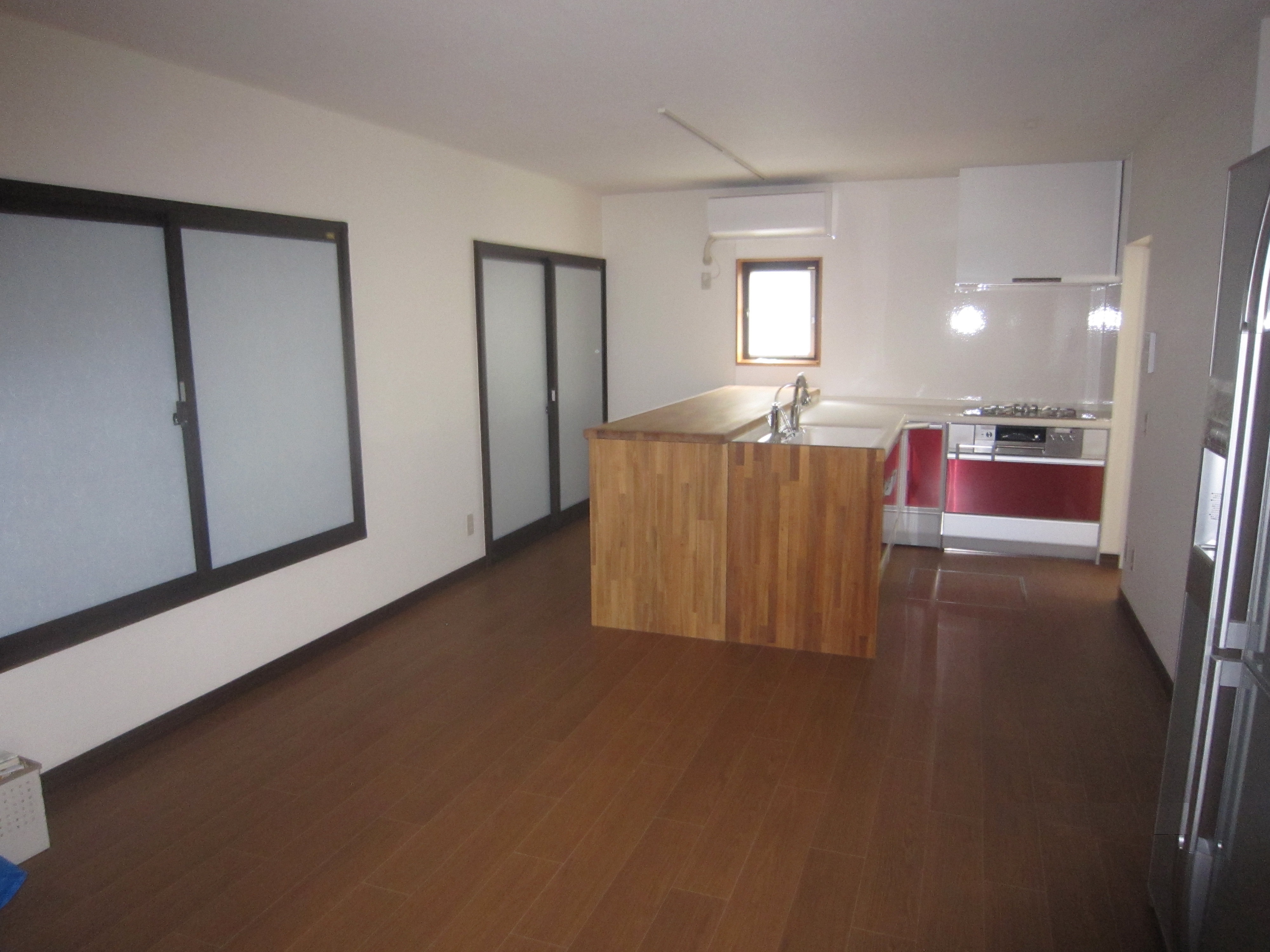 リビングに対面式のキッチンを置き、窓はブラインドないぞうの開き窓。 インプラスを付け、ガラスは和紙帳のものを使いました。