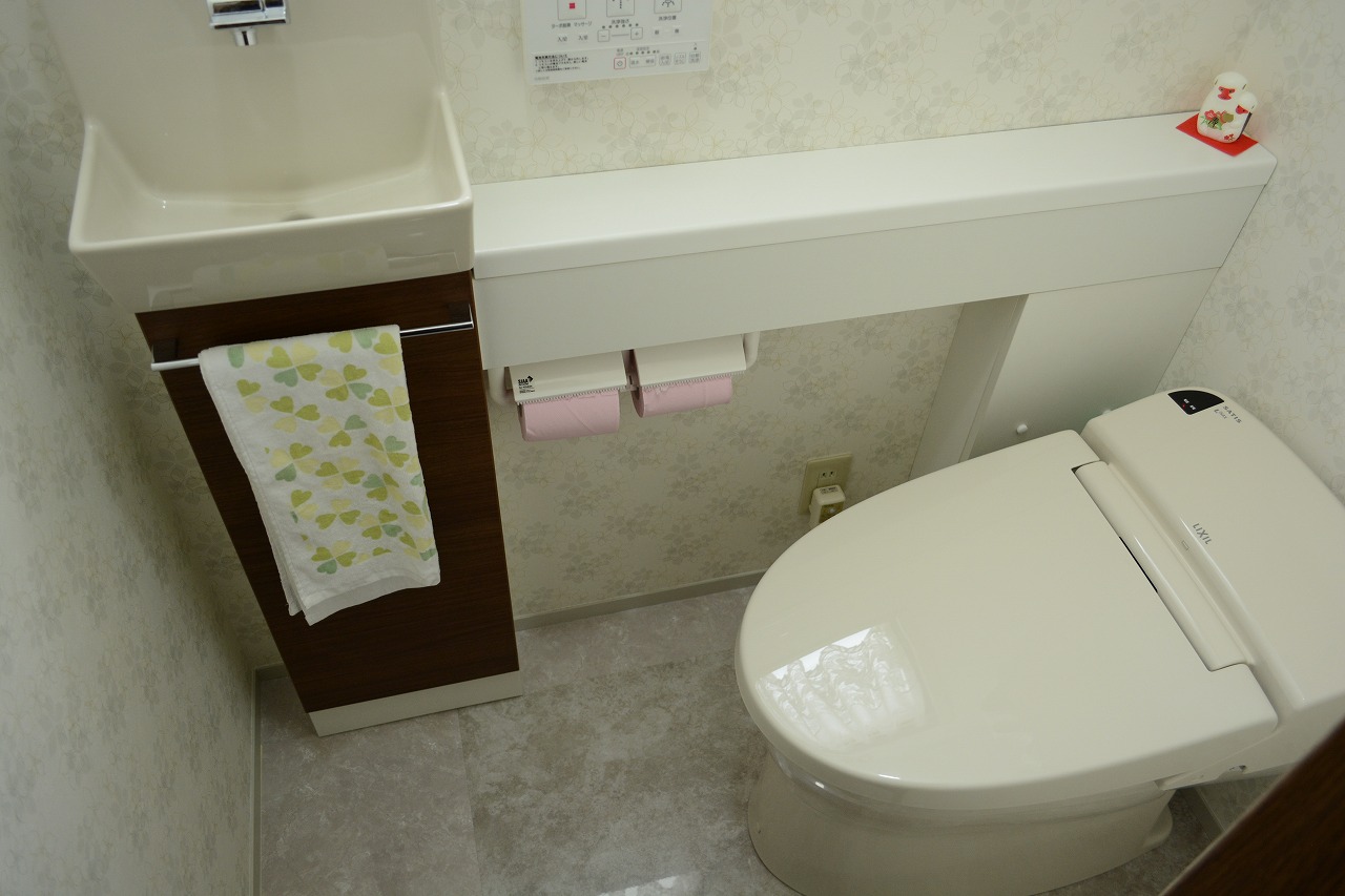 クロスとトイレ交換工事を行いました。以前のトイレとはまた違ったシックな空間になりホテルのトイレ空間の様になりました。