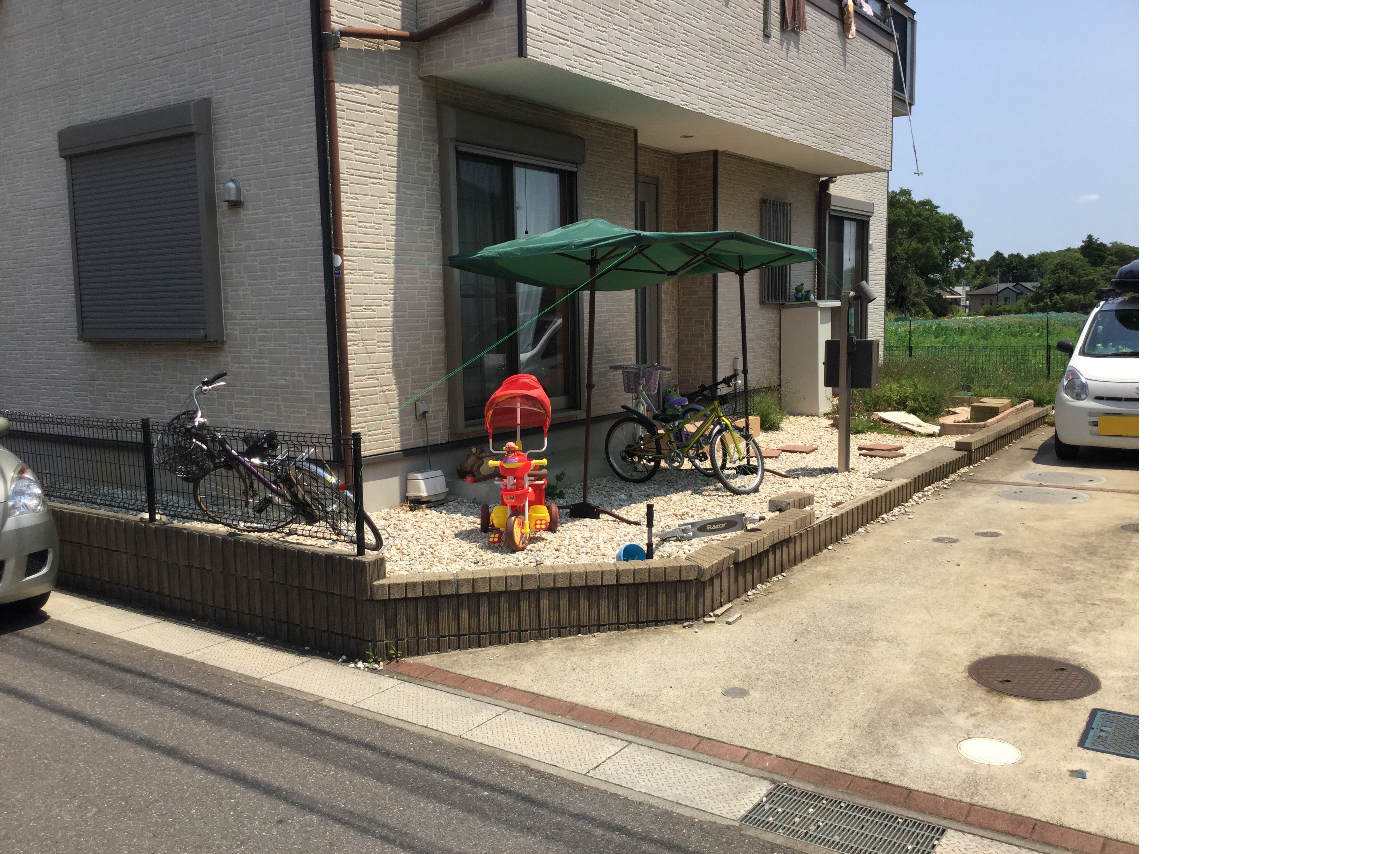 自転車の雨よけにご自身でテントをつけられていましたが、今回サイクルポート設置希望されました。外構を一部削り設置させて頂きました。
